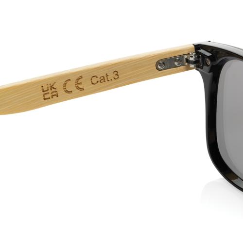 Sunglasses made with RCS certified recycled PC frame and FSC certified bamboo. With mirrored lenses for a trendy look. Total recycled content: 23% based on total item weight. RCS certification ensures a completely certified supply chain of the recycled materials. The lenses conform to EN ISO 12312-1,UV 400 and CAT 3. Packed in a FSC® Kraft box.