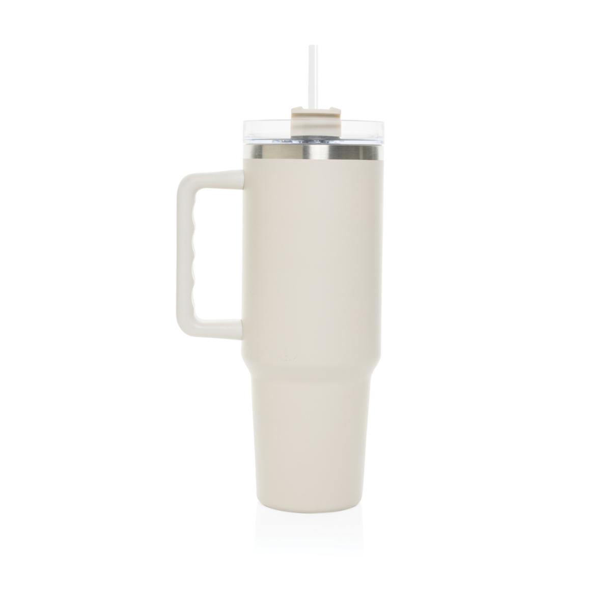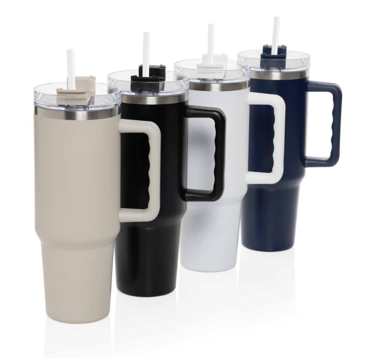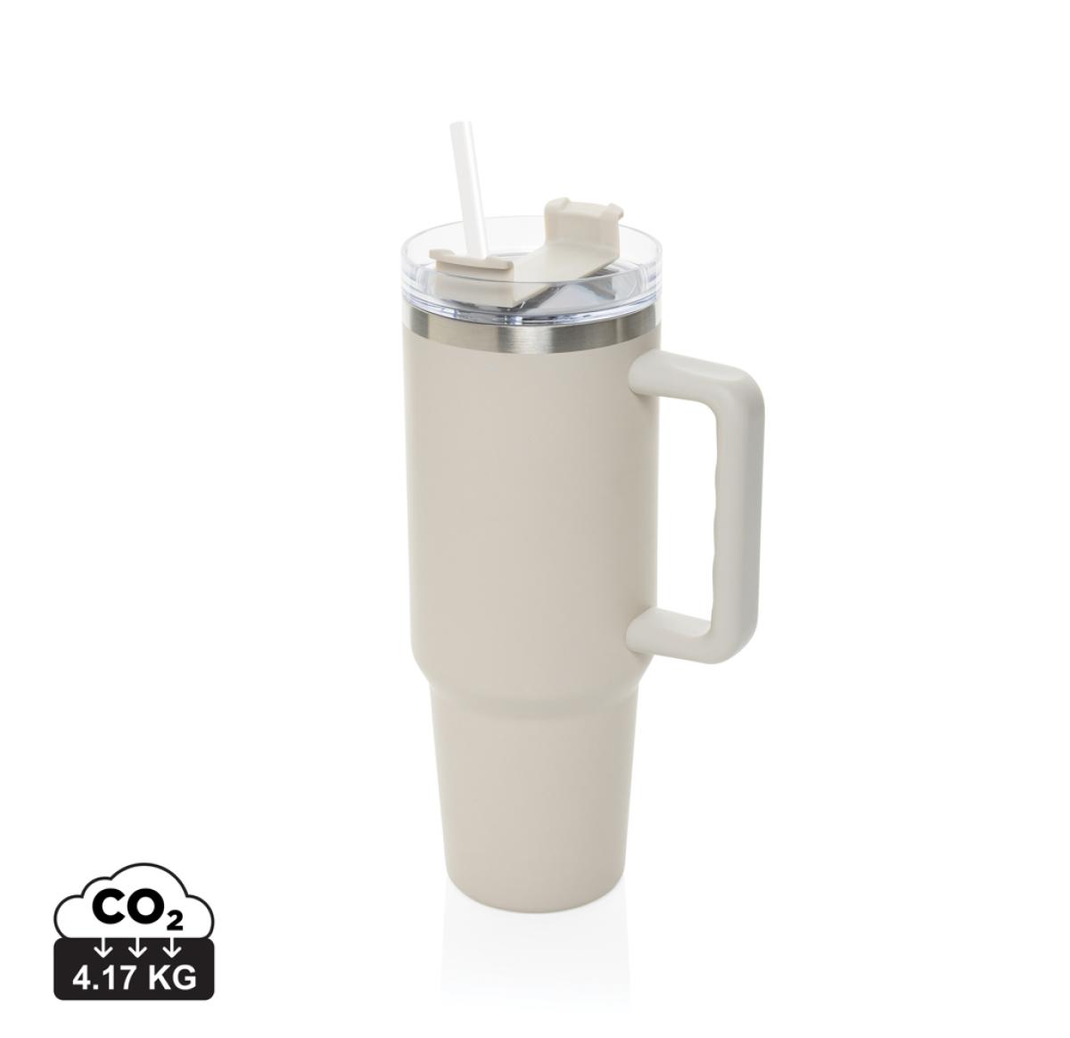 Meet Peakflow, the ultimate 1200ml tumbler designed for those who need a little extra. Its comfort-grip handle and slim base make it easy to carry and fit into most cup holders, keeping you hydrated on the go. Outside made from durable recycled stainless steel, Peakflow’s double-walled, vacuum-insulated body keeps drinks at the perfect temperature. It features a spill-proof lid with a dual function for sipping or using the included recycled steel straw. RCS-certified, with 29% recycled content, and BPA-free. Perfectly practical and lower impact, we recommend handwashing. Bulk packed.