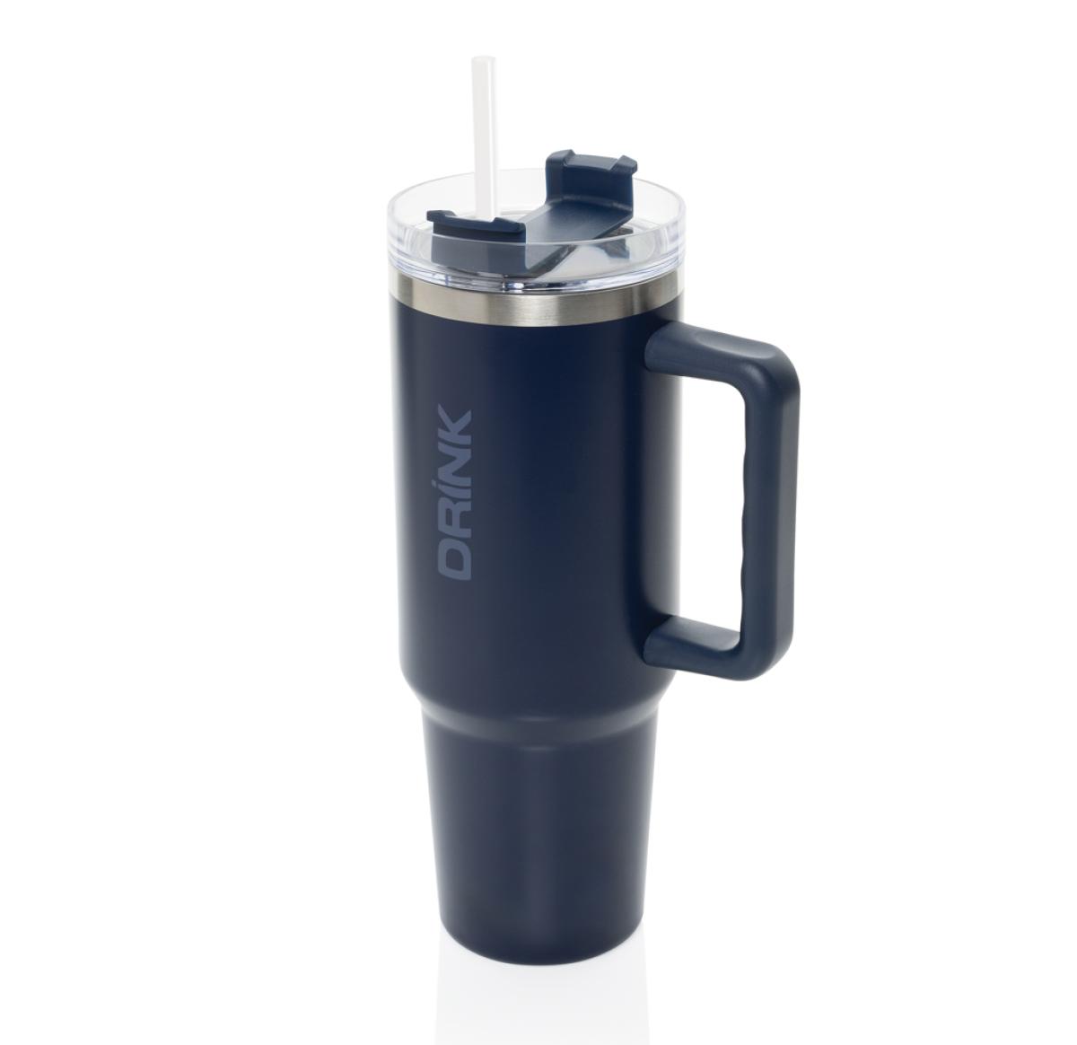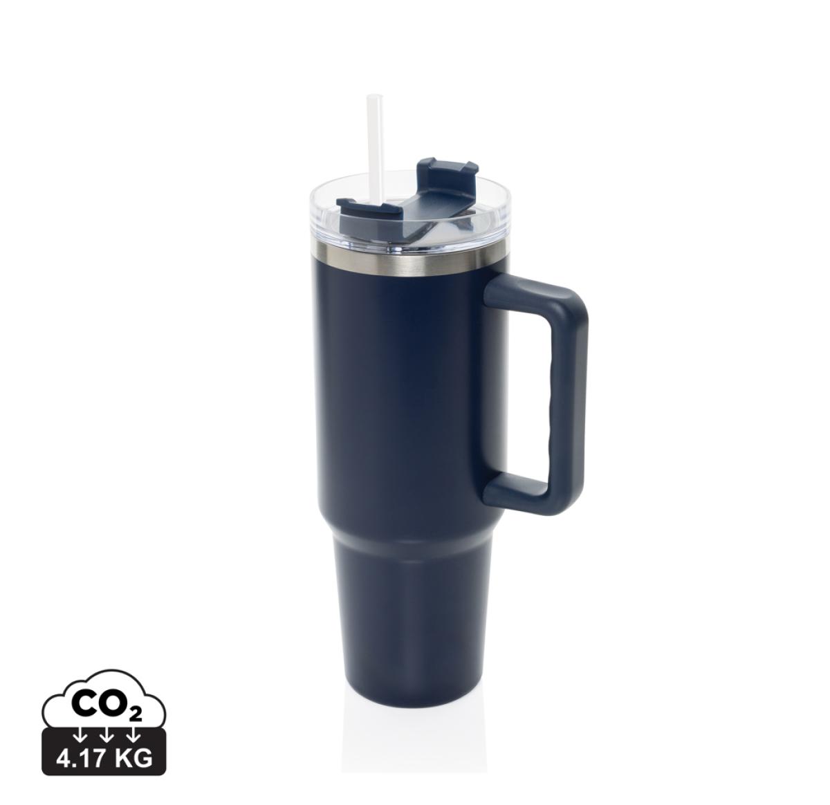 Meet Peakflow, the ultimate 1200ml tumbler designed for those who need a little extra. Its comfort-grip handle and slim base make it easy to carry and fit into most cup holders, keeping you hydrated on the go. Outside made from durable recycled stainless steel, Peakflow’s double-walled, vacuum-insulated body keeps drinks at the perfect temperature. It features a spill-proof lid with a dual function for sipping or using the included recycled steel straw. RCS-certified, with 29% recycled content, and BPA-free. Perfectly practical and lower impact, we recommend handwashing. Bulk packed.