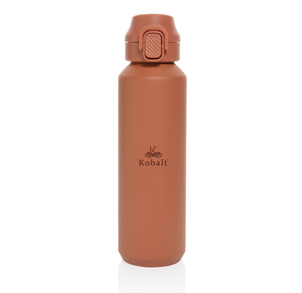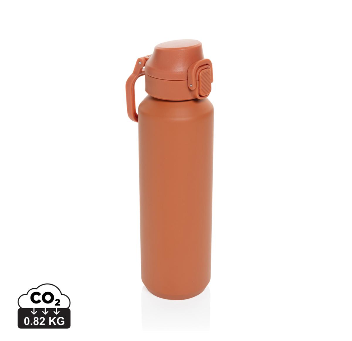 The Via RCS bottle is made from certified recycled 304 steel. This waterbottle features single-wall construction with a unique screw-on and lockable leak-resistant lid. Single hand operation. Press to open the lid for easy sip. Can be used for cold drinks only. Hand wash only. Made with RCS (Recycled Claim Standard) certified recycled materials. RCS certification ensures a completely certified supply chain of the recycled materials. Total recycled content: 73% based on total item weight. BPA free. Bulk packed. 600 ml. capacity