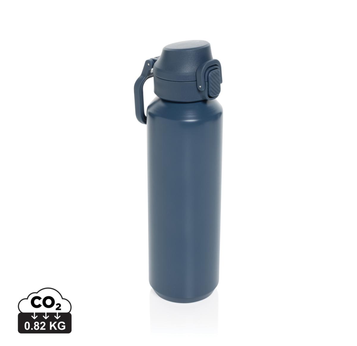 The Via RCS bottle is made from certified recycled 304 steel. This waterbottle features single-wall construction with a unique screw-on and lockable leak-resistant lid. Single hand operation. Press to open the lid for easy sip. Can be used for cold drinks only. Hand wash only. Made with RCS (Recycled Claim Standard) certified recycled materials. RCS certification ensures a completely certified supply chain of the recycled materials. Total recycled content: 73% based on total item weight. BPA free. Bulk packed. 600 ml. capacity