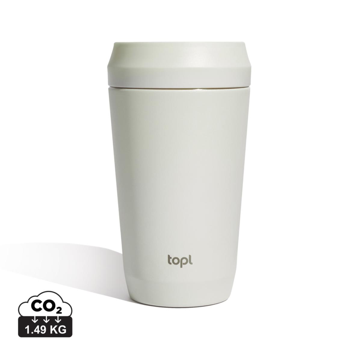 Meet the Topl Cup, your perfect fit for barista size 12oz (354ml) for your favorite tall brew. Made with RCS certified recycled materials and vacuum insulated, it keeps drinks at the perfect temperature. Its patented 360° sip design and transparent lid offer practicality and style for your daily adventures, whether you’re strolling the park or commuting to work. Made with 64% recycled material