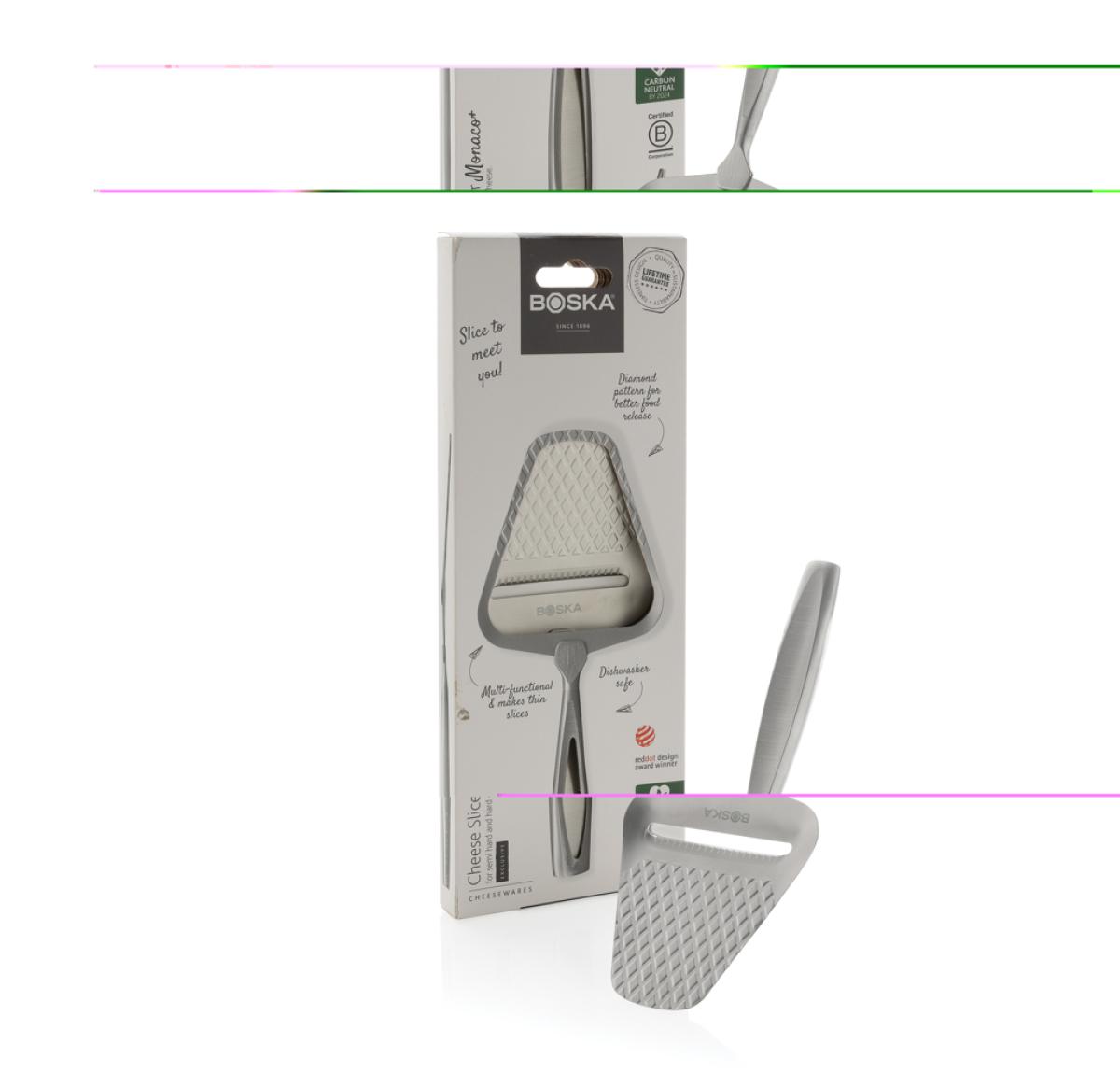 The Cheese Slicer Monaco+ is the true superstar, as far as cheese slicers go. This stainless steel slicer, from the brand BOSKA – a B Corporation certified company – is suitable for all types of cheese, dishwasher- and refrigerator-safe, and features a unique non-stick diamond pattern. Awarded the prestigious Red Dot Design Award and backed by a lifetime guarantee, this cheese slicer combines top-notch quality with style.