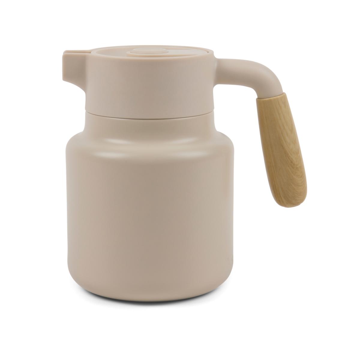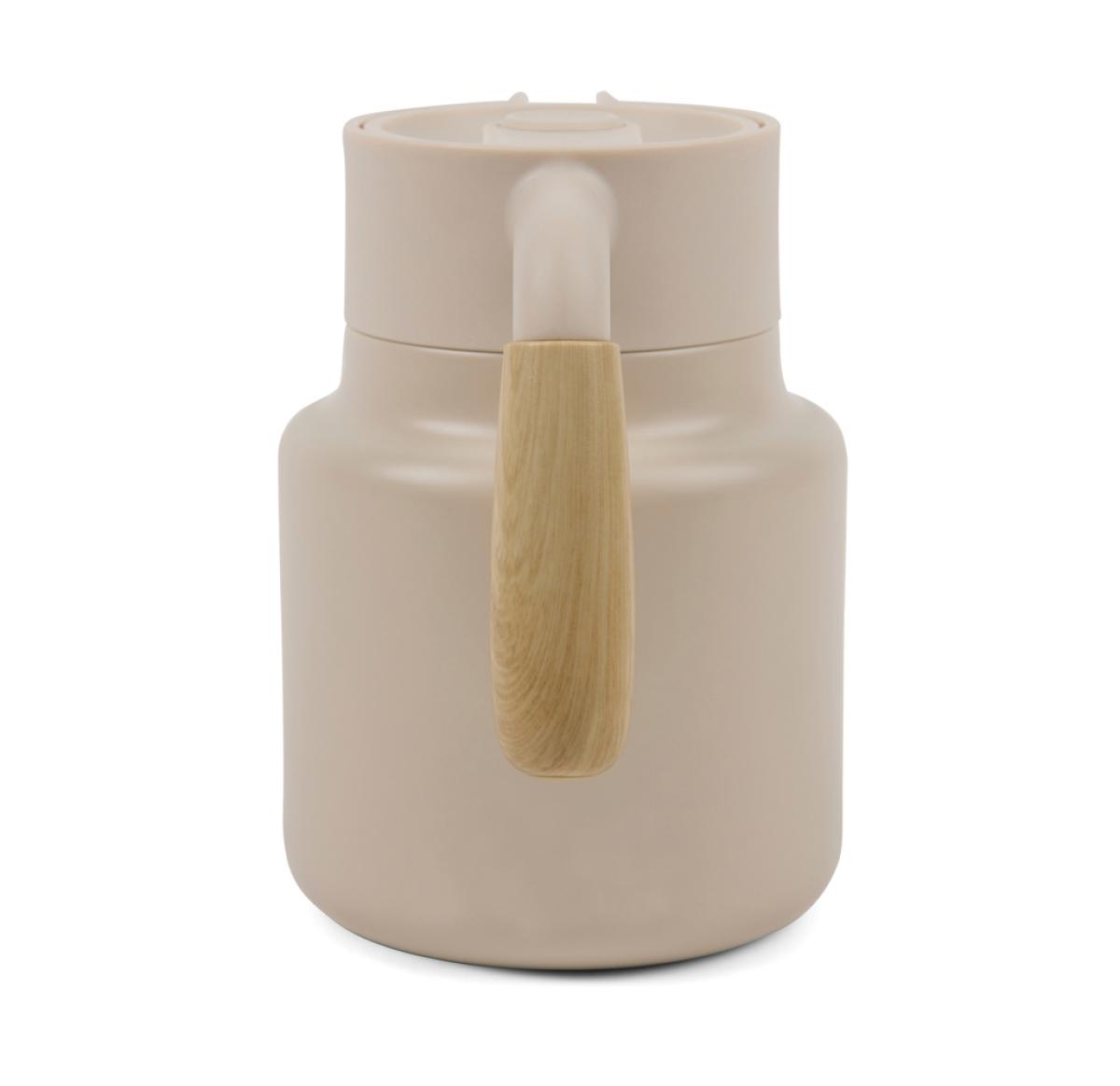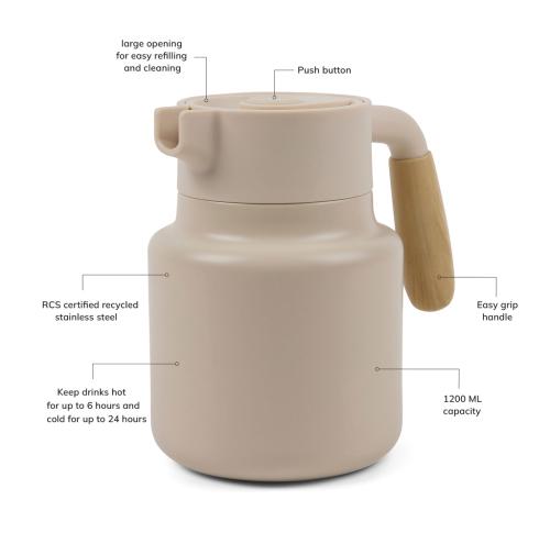 Keep your beverage warm or cold with this stylish vacuum jug made from RCS certified recycled stainless steel. With a capacity of 1200 ML. Both functional and elegantly designed, it complements any table setting. The lid features a convenient push button with a large opening for easy refilling and cleaning. The handle made from PP has an natural wood-like appearance. Easy to grip and pour from. This vacuum jug can keep drinks hot for up to 6 hours and cold for up to 24 hours. Handwash only. Not microwave safe. Certified by RCS (Recycled Claim Standard), RCS certification guarantees that the entire supply chain of recycled materials is certified. The total recycled content is based on the overall product weight. This product contains 62% RCS certified recycled stainless steel.