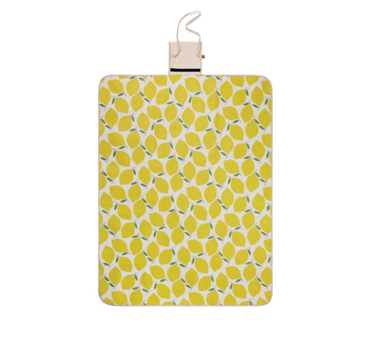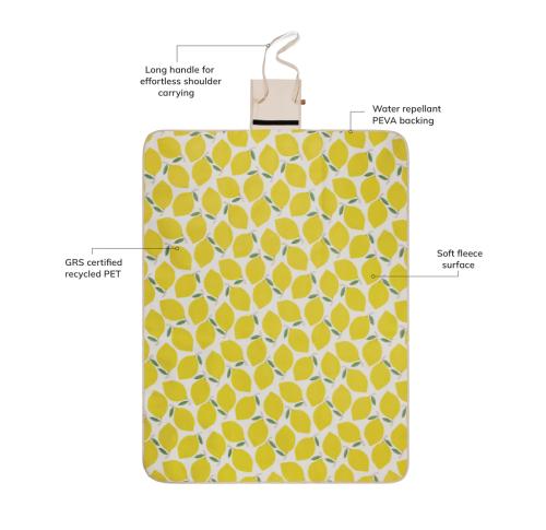 Elevate your outdoor adventures with this GRS certified recycled PET picnic blanket. Featuring a soft fleece surface with a lively lemon pattern and convenient water repellent PEVA backing. The smart design with a cotton canvas flap and long handle, makes the blanket easy to fold and carry, perfect for both the beach or the park. Certified by GRS (Global Recycled Standard), GRS certification guarantees that the entire supply chain of the recycled materials is certified. The total recycled content is based on the overall product weight. This product contains 51% GRS certified recycled PET.