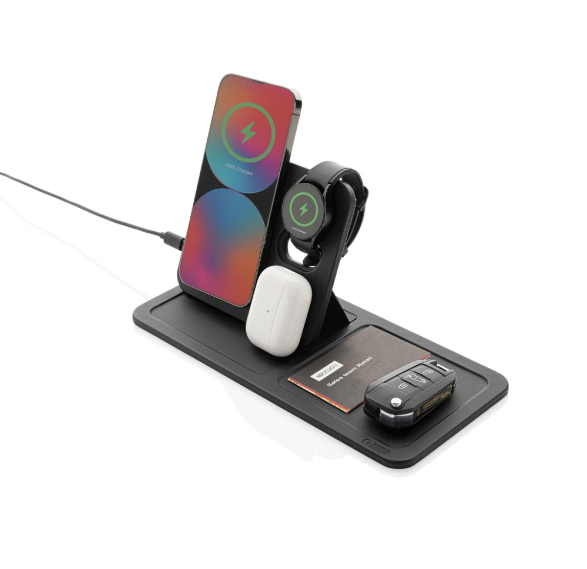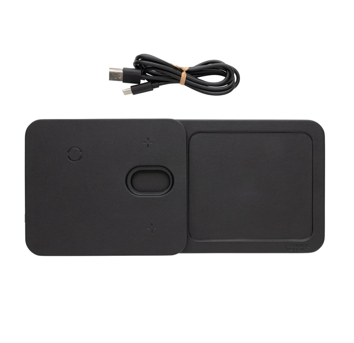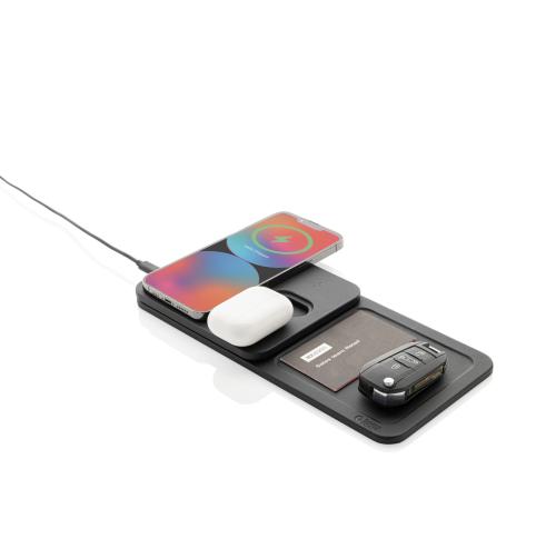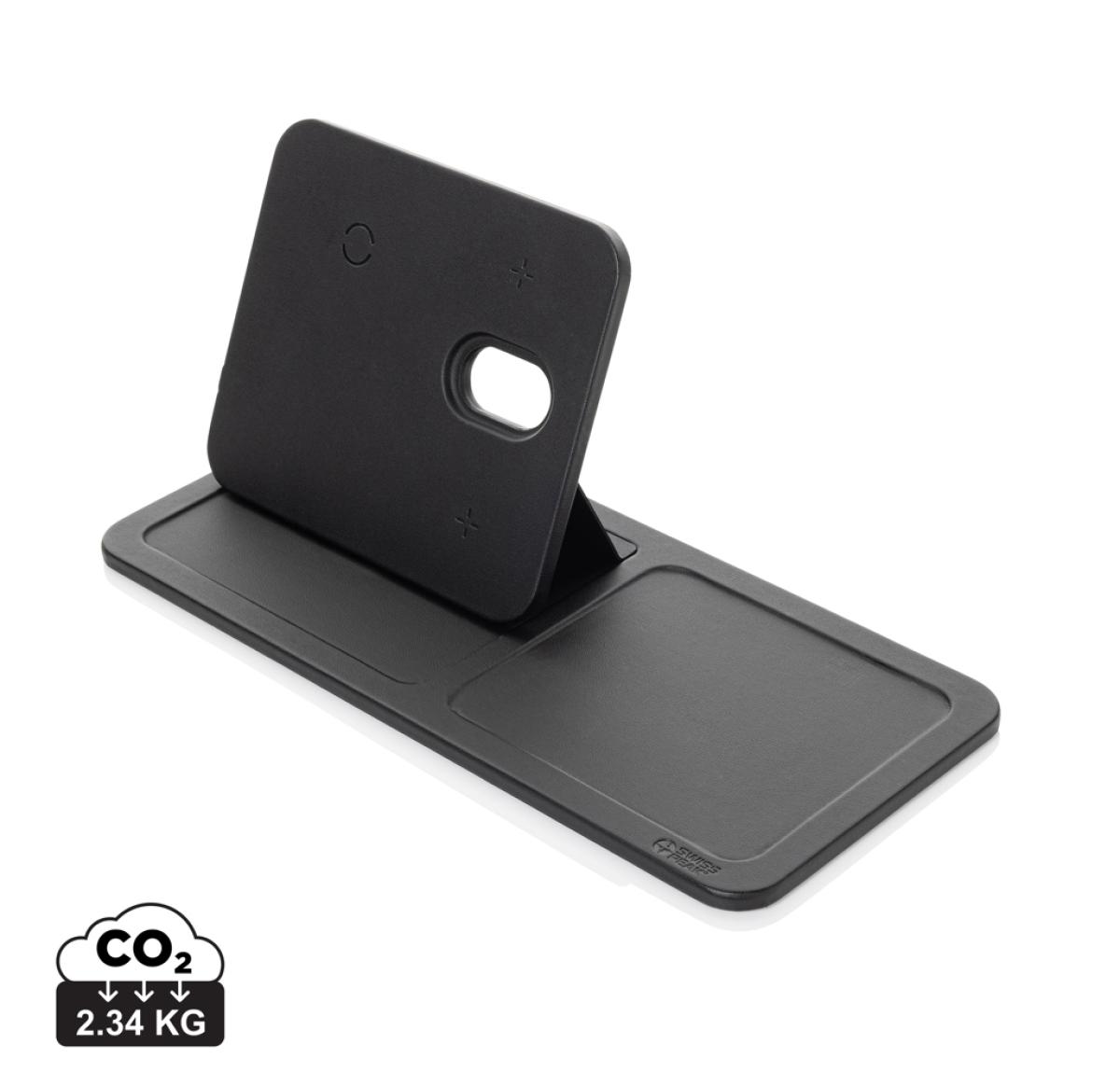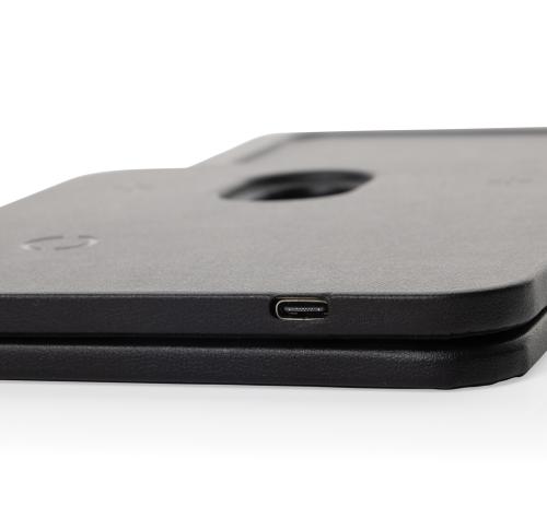 Luxury and foldable 3-in-1 wireless charger with desk tray made with RCS recycled PU.Total recycled content: 5% based on total item weight. RCS certification ensures a completely certified supply chain of the recycled materials. The wireless charger comes equipped with a magnetic 15W wireless charger and an additional 5W wireless charger suitable for earbuds cases or other small wireless chargeable devices and a 2.5W wireless charger for smartwatches ( Apple watches only). Including 120 cm TPE cable. Packed in FSC® mix packaging. Item and accessories 100% PVC free. Minimum Input: 9V/3A for optimal use. Output: Phone: 9V/1.1A; 9V/1.67 A/(15W), Earbuds: 5V/1A (5W), Watch: 5V/0.5A.