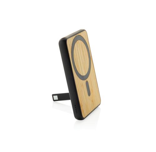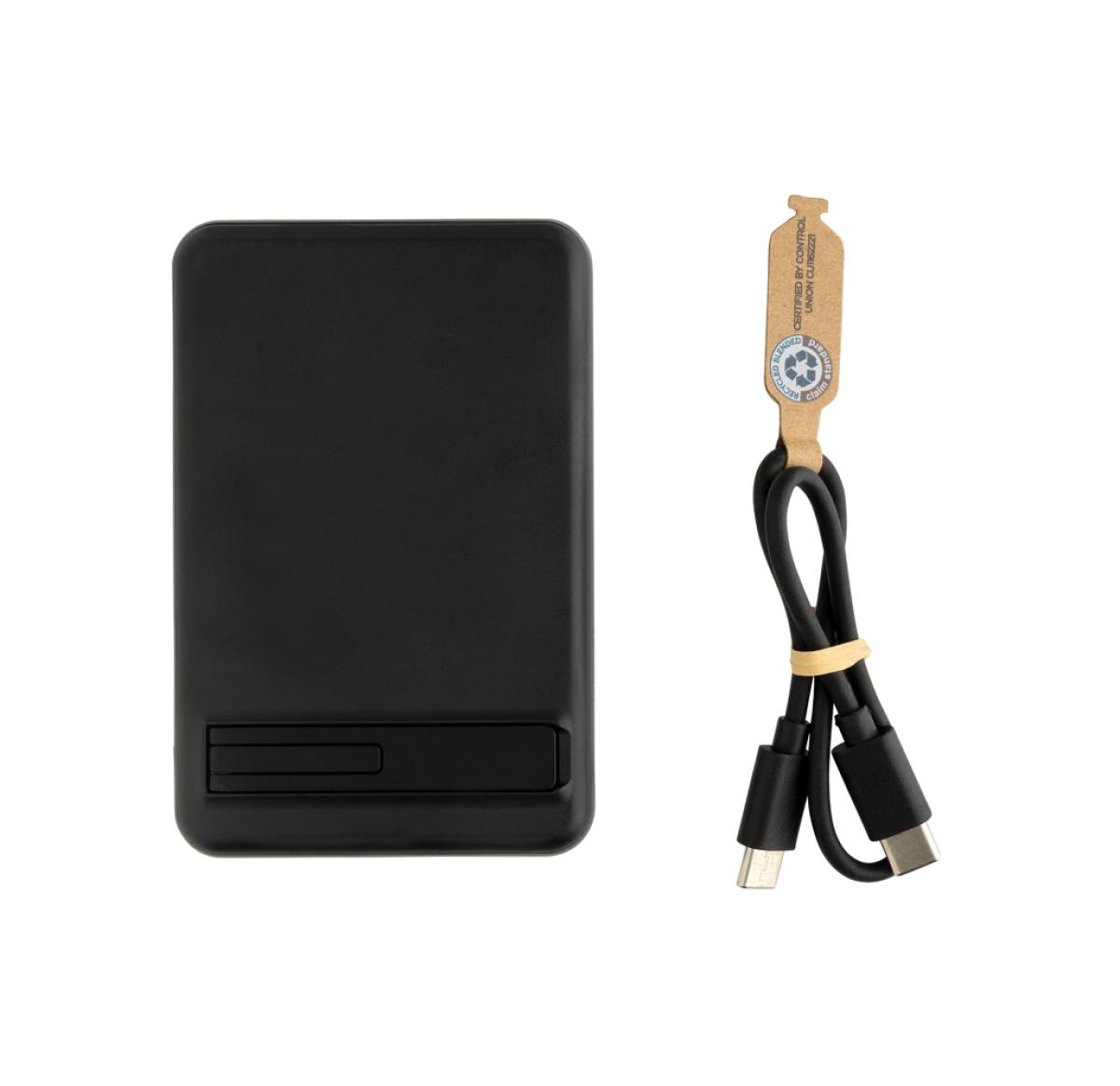 5.000 mAh pocket size powerbank with 5W magnetic wireless charger with a case made out of RCS certified recycled ABS plastic and FSC certified bamboo.. RCS (Recycled Claim Standard) is a standard to verify the recycled content of a product throughout the whole supply chain. Total recycled content: 22 % based on total item weight.The powerbank contains a long lasting grade A 5.000 mAh lithium polymer battery. With integrated phone stand. The power indicators will indicate the remaining energy level so you always know when to re-charge.; Type-C Input 5V/2.4A; Type C output:5V/2A.4A Item and accessories PVC free. Including RCS certified recycled TPE charging cable. Packed in FSC® mix packaging.