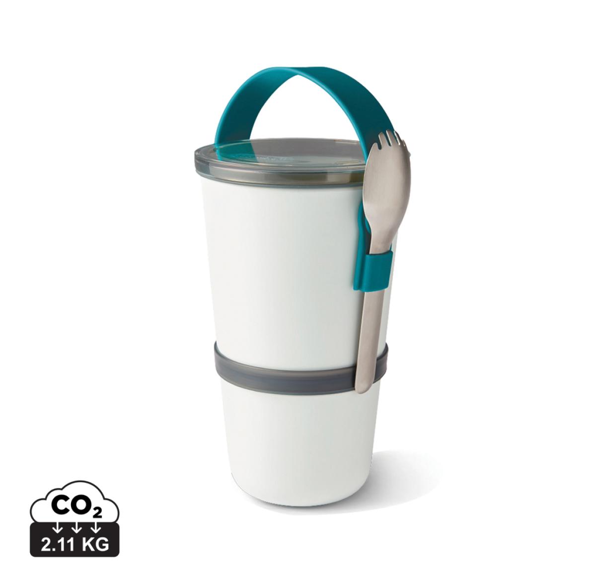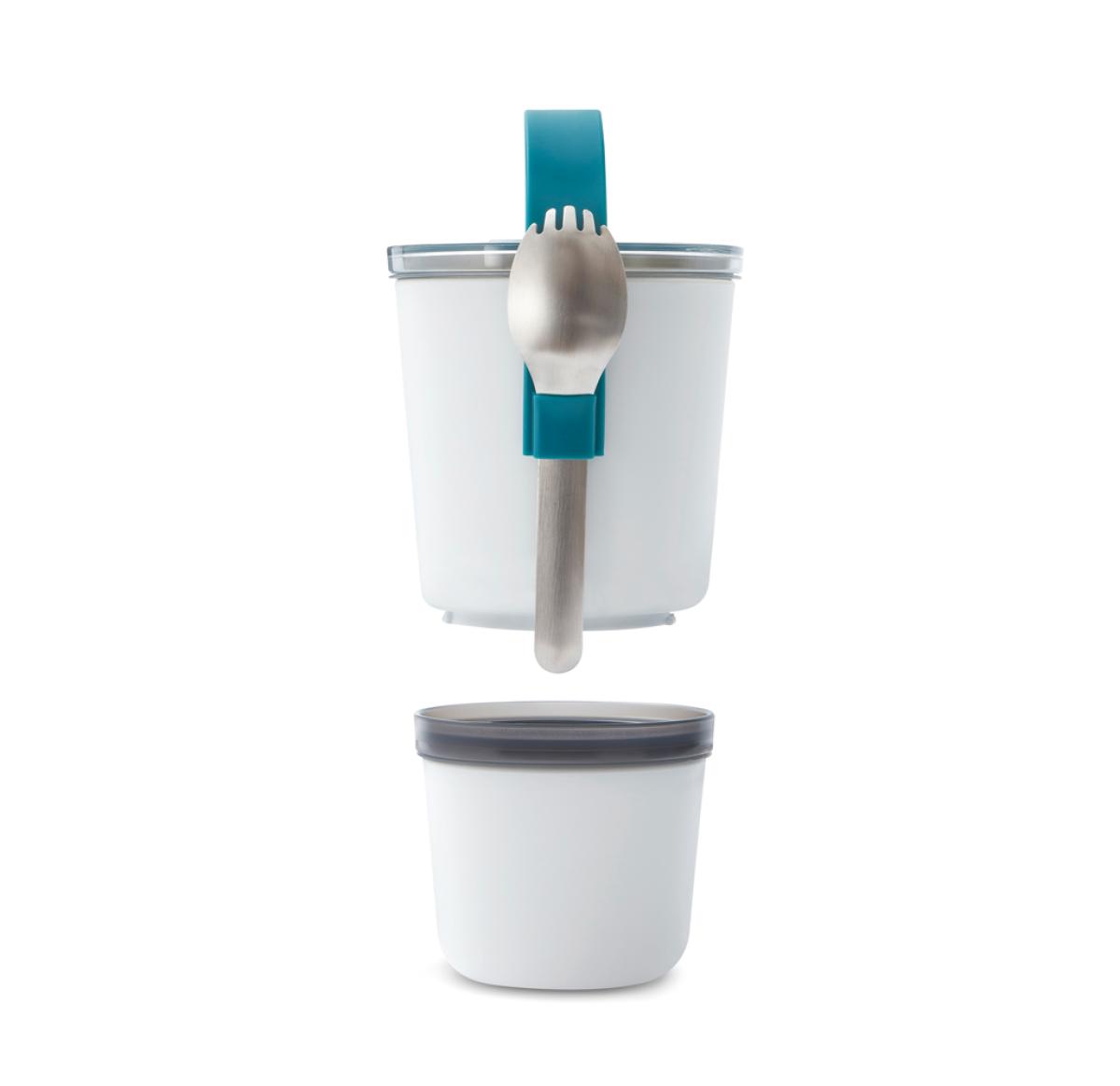 Inspired by Indian tiffin carriers, the Lunch Pot is slimmer and taller which makes it compact and easy to put in your bag. The Lunch Pot Original consists of two water-tight pots that can be locked together for carrying. The pots have a convenient silicone carrying strap which also holds the stainless steel “spork” (spoon and fork). Separate anything from yoghurt and fruit to noodles and soup. When you’re finished, the smaller pot fits inside the larger pot for easy storage. Microwave and dishwasher safe, apart from tritan lid.