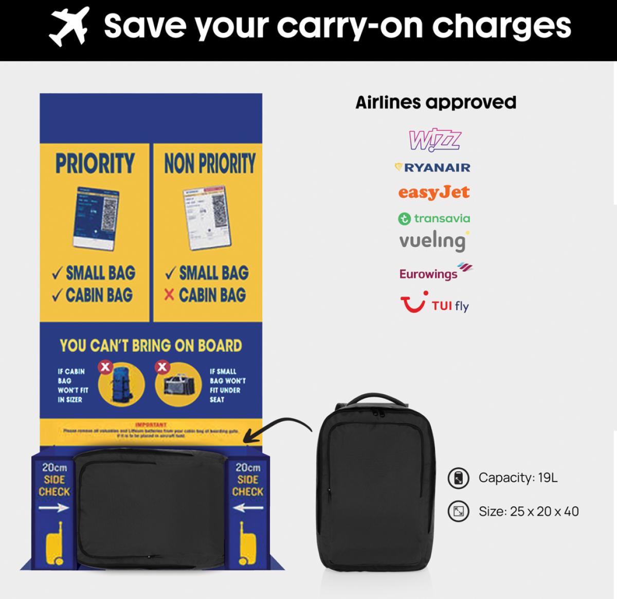 The Ace Aware™ RPET Free On Board Travel Pack is designed for the budget-conscious traveler who values convenience. Made from 100% rPET, this compact backpack features adjustable shoulder straps, a webbing handle on top, and a front zipper pocket for quick access to essentials. The main compartment includes an elastic trolley strap for added functionality, and with a 16L capacity, it fits under any airline seat. Perfect for weekend trips, this backpack meets the maximum free carry-on size requirements for budget airlines, ensuring no extra fees for your bag. Made with recycled polyester embedded with the AWARE™ tracer. 2% of proceeds of each product sold with AWARE™ will be donated to Water.org. PVC free.