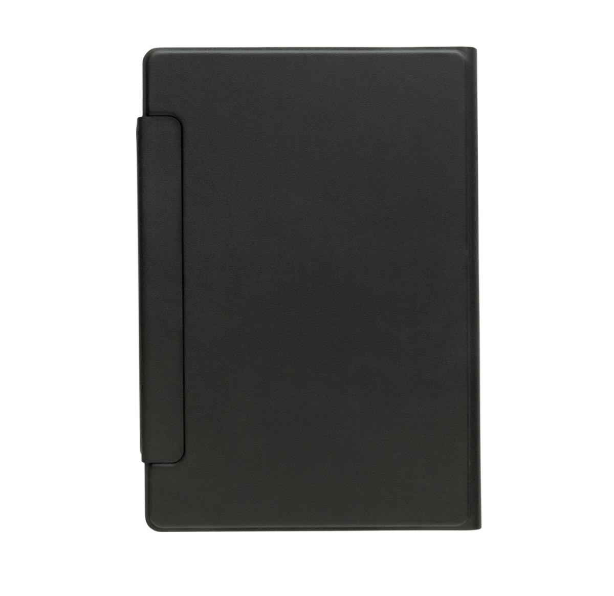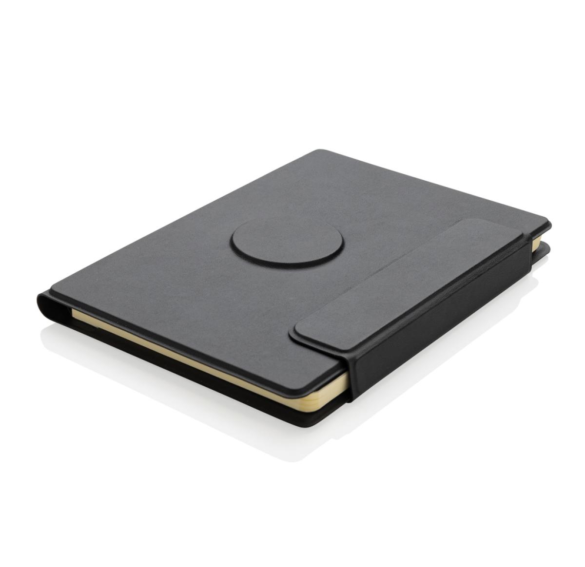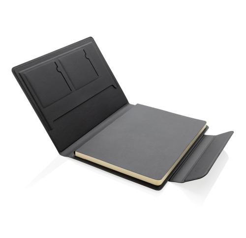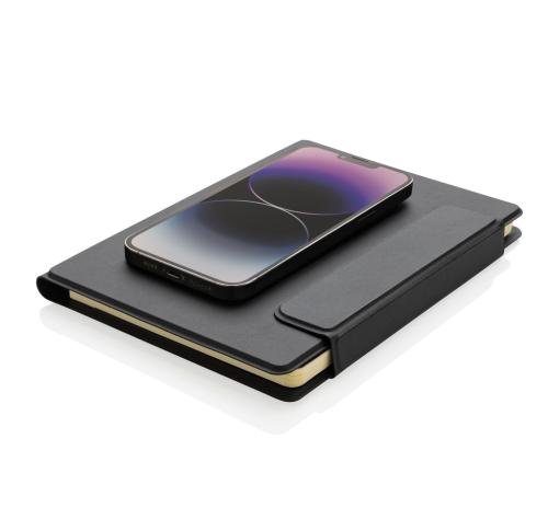 A5 portfolio, recycled polyester PU with magnetic closure and magnetic phone holder that is compatible with magsafe iPhones 12 or higher, inside A5 notebook with lines, innerp ages are FSC® certified and 64 sheets/128 pages; cream paper colour with lines; paper weight 80gsm, documents pocket and 2 business card slots. Notebook is refillable.