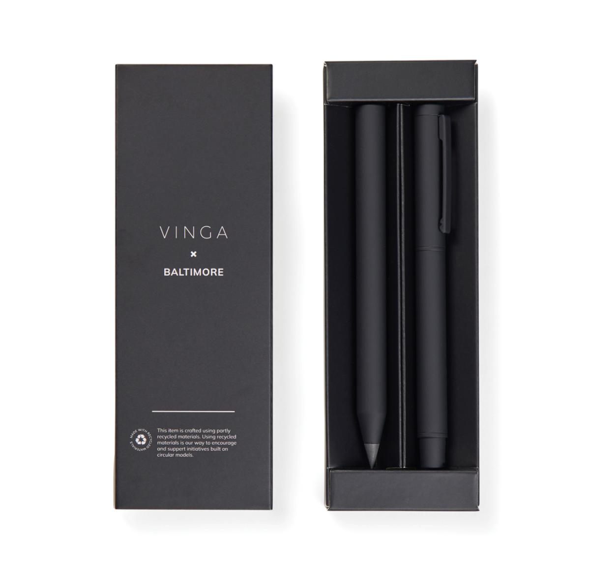 This modern and sleek set includes two pens: an eternal pen and a classic ballpoint pen with a cap and clip. Designed for both style and functionality, these pens are crafted from RCS certified recycled stainless steel, featuring a rubber surface coating for a comfortable grip and a matt finish. Both pens have a balanced weight that ensures stability and effortless writing. The eternal pen offers limitless writing. The ballpoint pen features a fine 1.00 mm tip and provides smooth, consistent writing with documental blue ink, lasting up to 1200 metres. Certified by RCS (Recycled Claim Standard), RCS certification guarantees that the entire supply chain of recycled materials is certified. The total recycled content is based on the overall product weight. This product contains 52% RCS certified recycled aluminum and 10% RCS certified stainless steel.