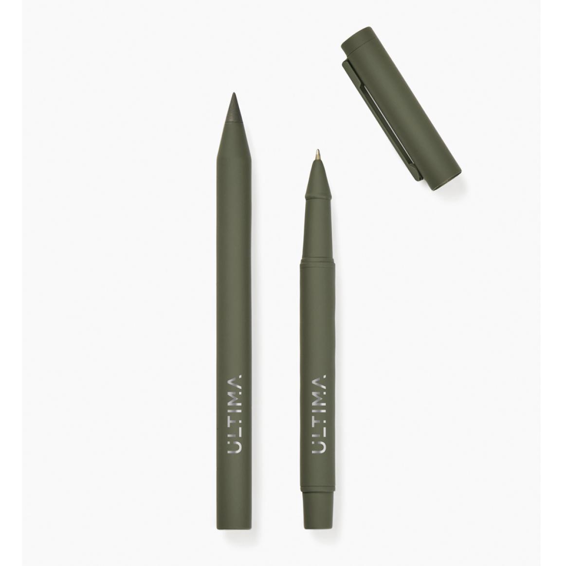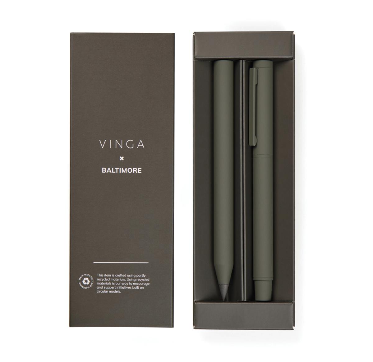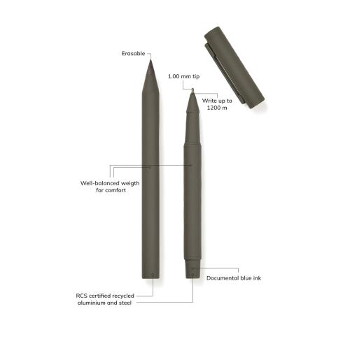 This modern and sleek set includes two pens: an eternal pen and a classic ballpoint pen with a cap and clip. Designed for both style and functionality, these pens are crafted from RCS certified recycled stainless steel, featuring a rubber surface coating for a comfortable grip and a matt finish. Both pens have a balanced weight that ensures stability and effortless writing. The eternal pen offers limitless writing. The ballpoint pen features a fine 1.00 mm tip and provides smooth, consistent writing with documental blue ink, lasting up to 1200 metres. Certified by RCS (Recycled Claim Standard), RCS certification guarantees that the entire supply chain of recycled materials is certified. The total recycled content is based on the overall product weight. This product contains 52% RCS certified recycled aluminum and 10% RCS certified stainless steel.