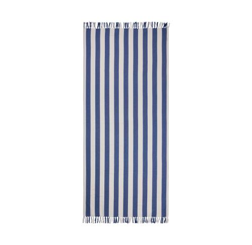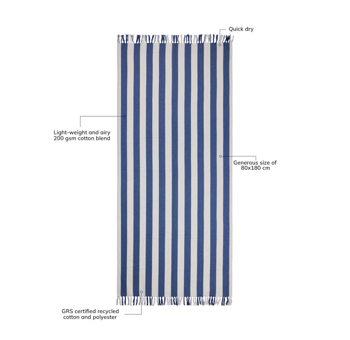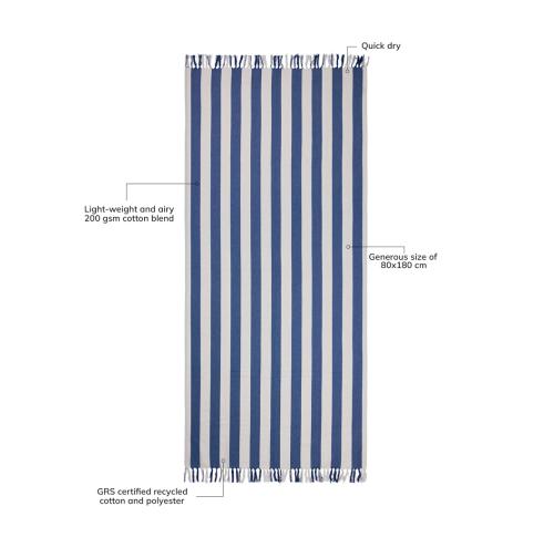 This hammam beach towel features a classic two-coloured striped pattern with fringes on the short sides. Crafted from a lightweight and airy 200 gsm blend, it combines the comfort of cotton with the quick-drying benefits of polyester. Measuring 80x180 cm, it is perfect for the beach or poolside. Certified by GRS (Global Recycled Standard), GRS certification guarantees that the entire supply chain of the recycled materials is certified. The total recycled content is based on the overall product weight. This product contains 68% GRS certified recycled cotton and 29% GRS certified recycled polyester.