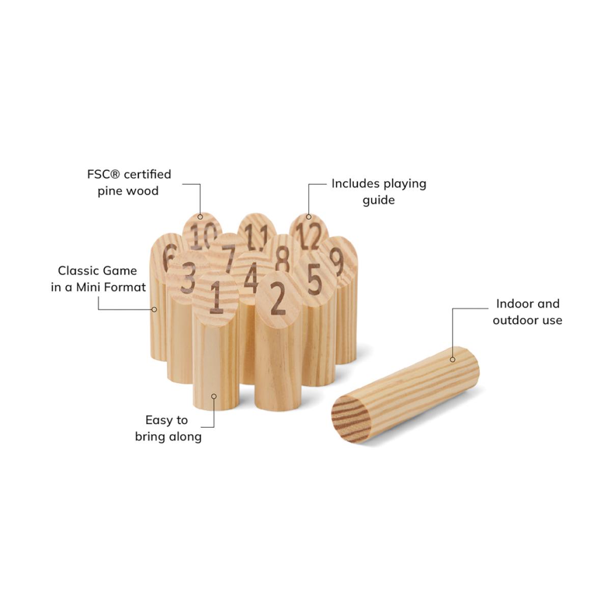 This handy mini version of Muge number game is a tactical game including twelve numbered pins and one throwing pin. Simple, timeless design crafted from FSC® certified pine wood. It is the perfect game to bring along and play wherever it suits you. The goal is to be the first to reach exactly 50 points. The game is conveniently packed in a canvas bag with a mesh back making it easy to carry along. Instruction leaflet is included.