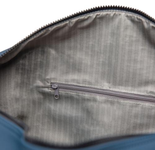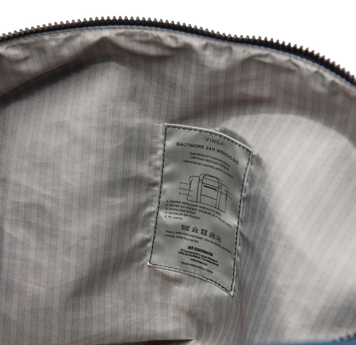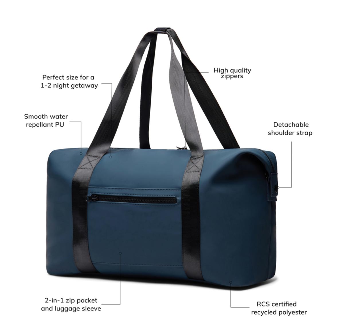 A travel sized weekend bag crafted from partly RCS certified recycled polyester with a sleek PU coating. Designed to accommodate everything you need for a 1-2 night getaway. Simply secure your bag to your trolley with a clever 2-in-1 zip pocket. Featuring both comfortable carry hand-hold straps and a detachable adjustable shoulder strap. Inside a smaller zip pocket for your essentials. Certified by RCS (Recycled Claim Standard), RCS certification guarantees that the entire supply chain of recycled materials is certified. The total recycled content is based on the overall product weight. This product contains 20% RCS certified recycled polyester.