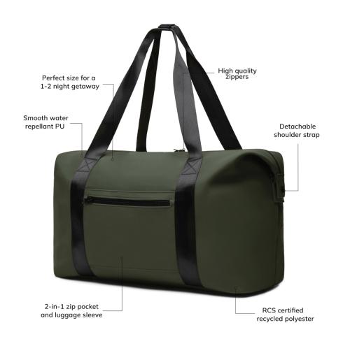 A travel sized weekend bag crafted from partly RCS certified recycled polyester with a sleek PU coating. Designed to accommodate everything you need for a 1-2 night getaway. Simply secure your bag to your trolley with a clever 2-in-1 zip pocket. Featuring both comfortable carry hand-hold straps and a detachable adjustable shoulder strap. Inside a smaller zip pocket for your essentials. Certified by RCS (Recycled Claim Standard), RCS certification guarantees that the entire supply chain of recycled materials is certified. The total recycled content is based on the overall product weight. This product contains 20% RCS certified recycled polyester.