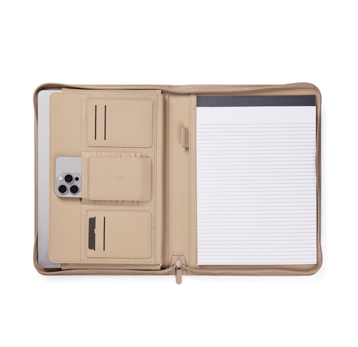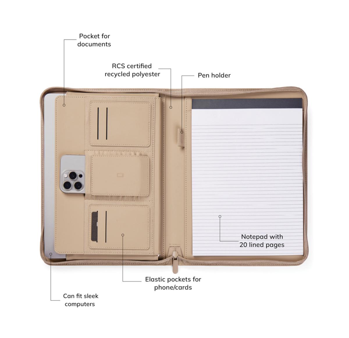 Stay organised and carry your important essentials with this sleek A4-sized portfolio. Featuring a pen holder, a pocket for paper, elastic band pockets for cards, phone, along with a notepad containing 20 lined pages. Made from partly recycled polyester, with the classic Baltimore matt PU coating, this portfolio is the ideal accessory for your desk or for taking on the go. The paper insert is replaceable, ensuring long-lasting use. Certified by RCS (Recycled Claim Standard), RCS certification guarantees that the entire supply chain of recycled materials is certified. The total recycled content is based on the overall product weight. This product contains 6% RCS certified recycled polyester.
