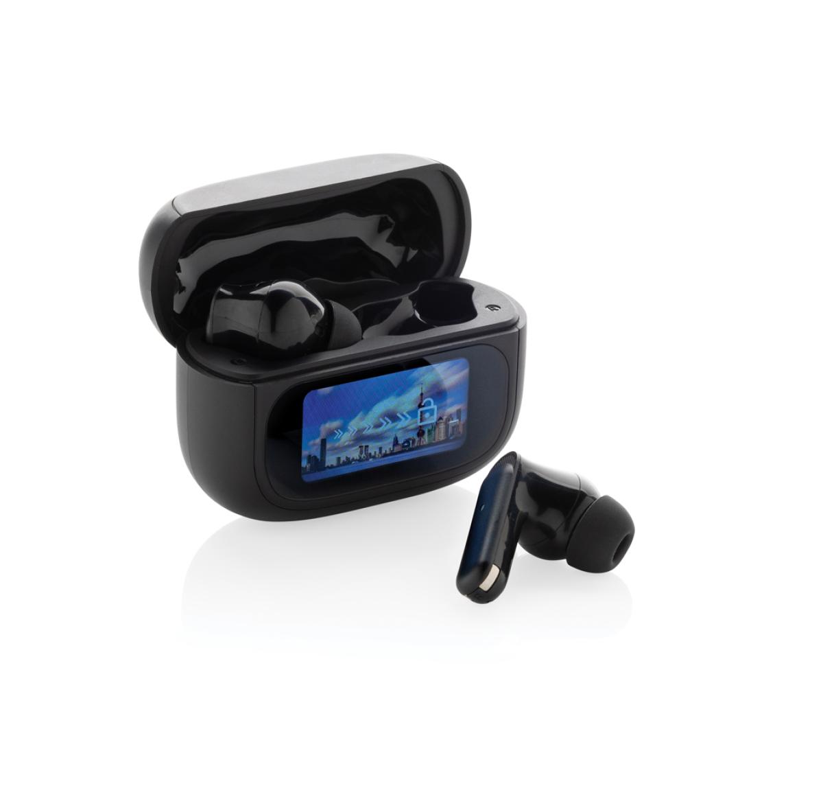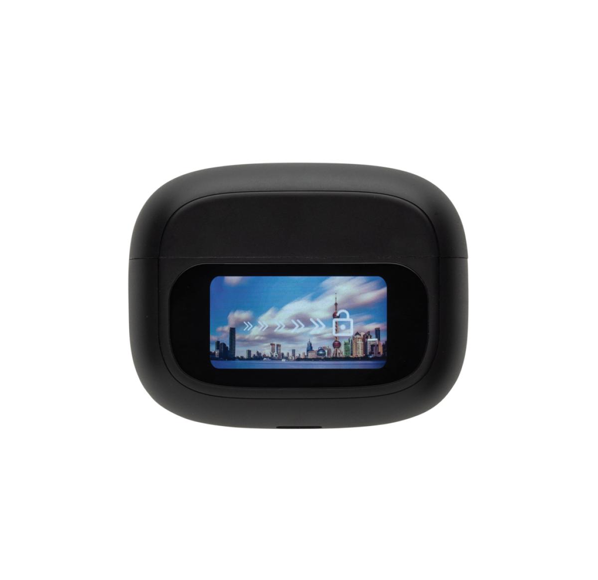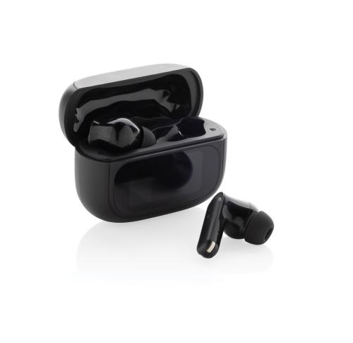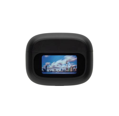 Commute, work or travel in silence with these ANC earbuds. The ANC function makes sure outside noise is reduced for optimal concentration. The charging case comes with an integrated TFT touch screen which offers many unique features: find your earbuds, adjust volume, select next song, answer calls and change language (select between 8 languages) and many more. The earbuds and charging case are made with RCS (Recycled Claim Standard) certified recycled ABS. Total recycled content: 43% based on total item weight. RCS certification ensures a completely certified supply chain of the recycled materials. The earbuds use BT 5.3 for automatic pairing without any hassle and a stable connection. The earbuds have a 30 mAh battery that allows a play time of up to 6 hours (with ANC) and can be re-charged in 1.5 hours in the charging case. ANC degree: 23 DB. Including 3 size eartips. IPX 4 waterproof. With ENC microphone for clear calls. Packed in FSC kraft box.