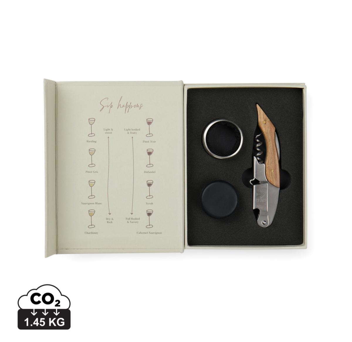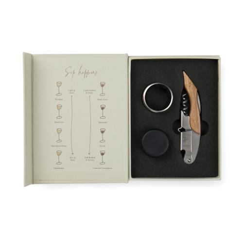 Embark on a sophisticated journey with the Story of Wine set, elegantly packed in a gift box that resembles a classic book. This set includes a waiter's corkscrew, a silicone bottle top to keep your wine fresh longer, and a drop stopper for drip-free pouring. The unique packaging not only protects your tools but also tells a captivating story of wine, making it a perfect gift for wine enthusiasts. The giftbox is crafted from FSC® certified paper.