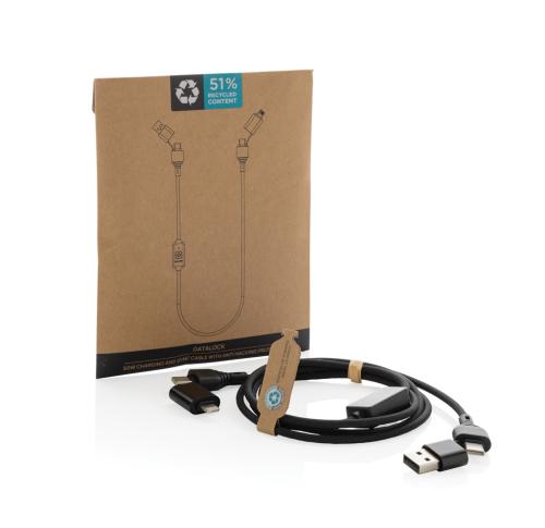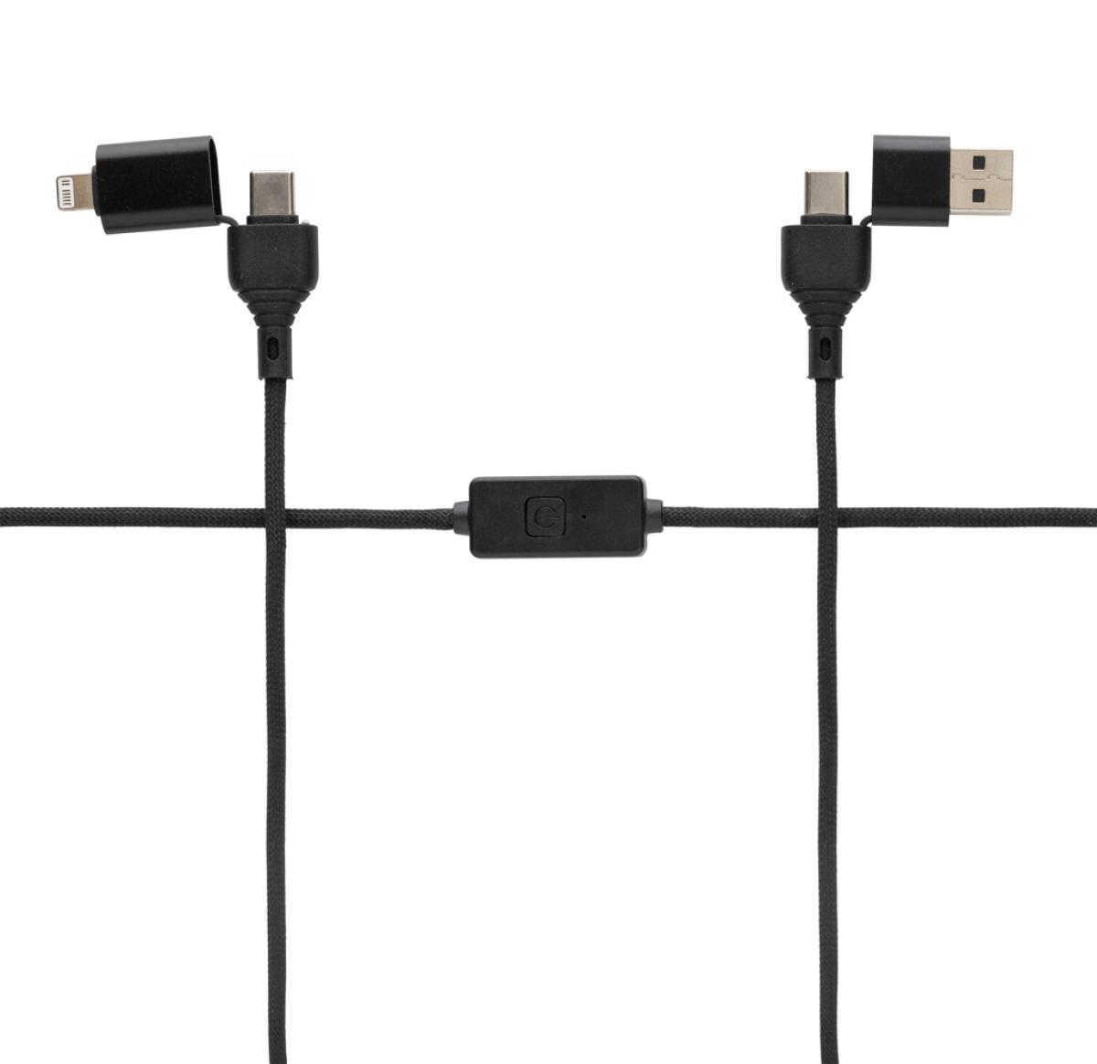 60W charging and data cable that can charge all your mobile devices at top speed and even supports laptop charging. The cable has a unique integrated button to switch off the data transfer function when using the cable in public to avoid data theft or hackers accessing your phone. Simply push the button to activate the protection mode. The cable is made with recycled TPE, PET, ABS and recycled aluminium. 120 CM long and supports Car play and Android auto (type C to type C only) . Total recycled content: 52% based on total item weight. RCS certification ensures a completely certified supply chain of the recycled materials. Packed in FSC mix packaging. PVC free.