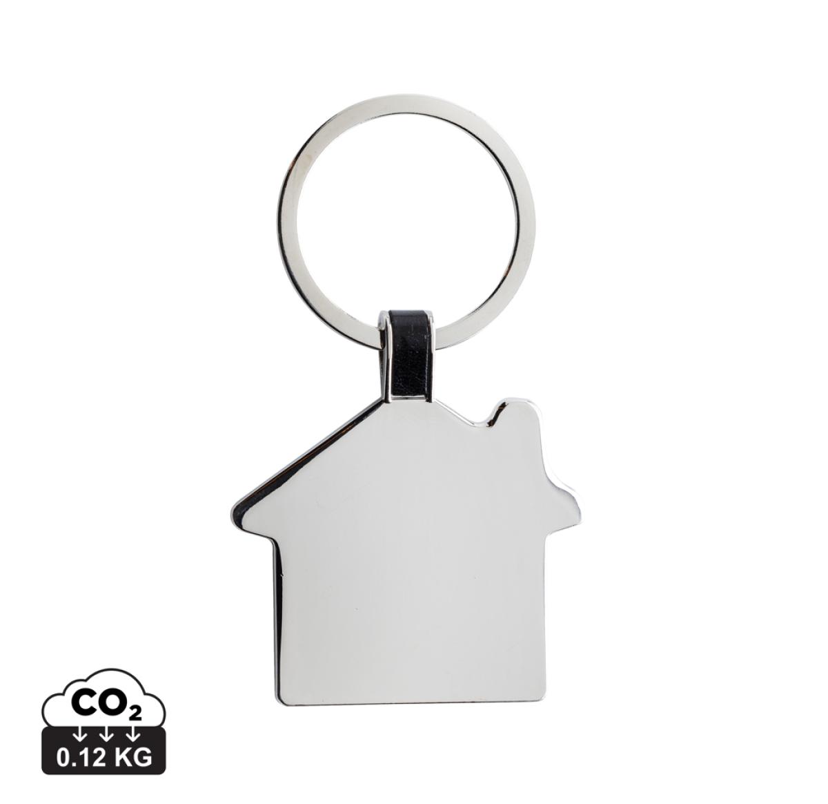 House shaped keychain made from RCS recycled zinc alloy. Total recycled content: 84% based on total item weight. RCS certification ensures a completely certified supply chain of the recycled materials. Packed in paper bag.