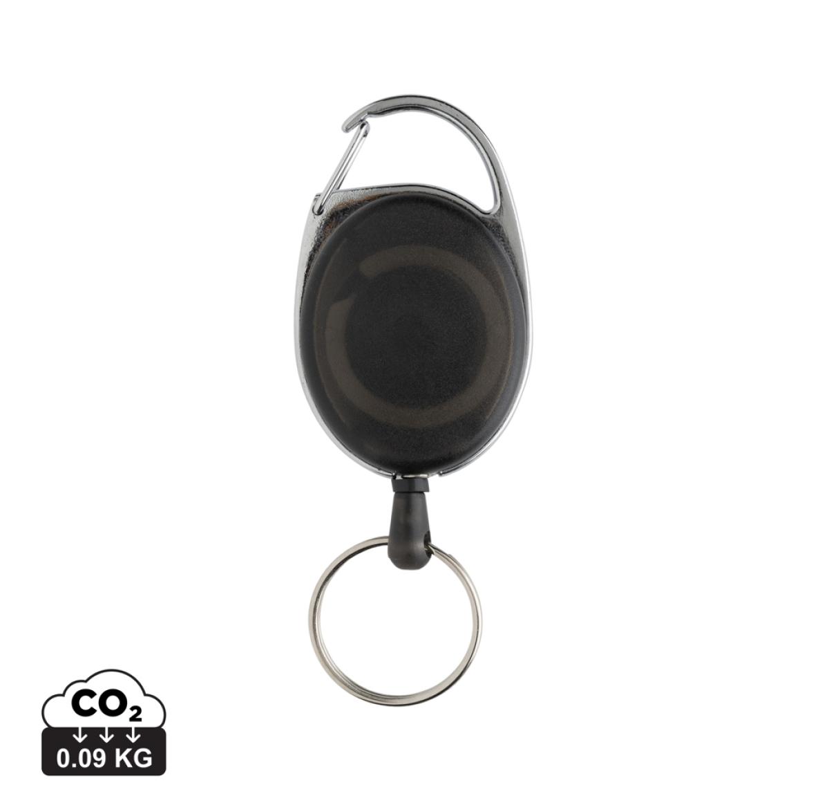Roller clip keychain made with RCS recycled ABS and zinc alloy. Ideal item for office, trade show or even when skiing. With 60cm cord to attach badge for easy access. With carabiner hook to attach to bag or clothing. Total recycled content: 34% based on total item weight. RCS certification ensures a completely certified supply chain of the recycled materials. Packed in paper bag.