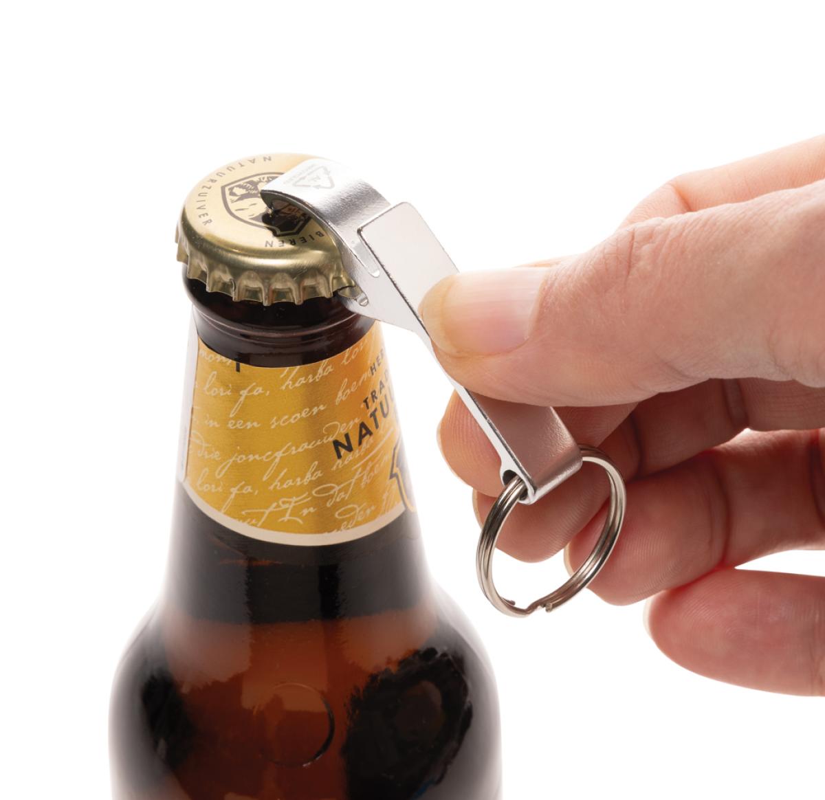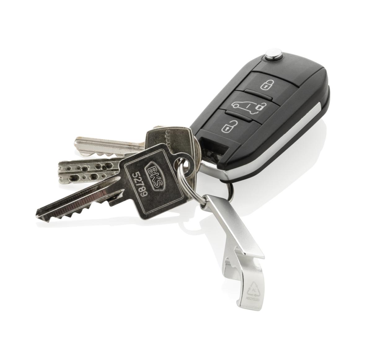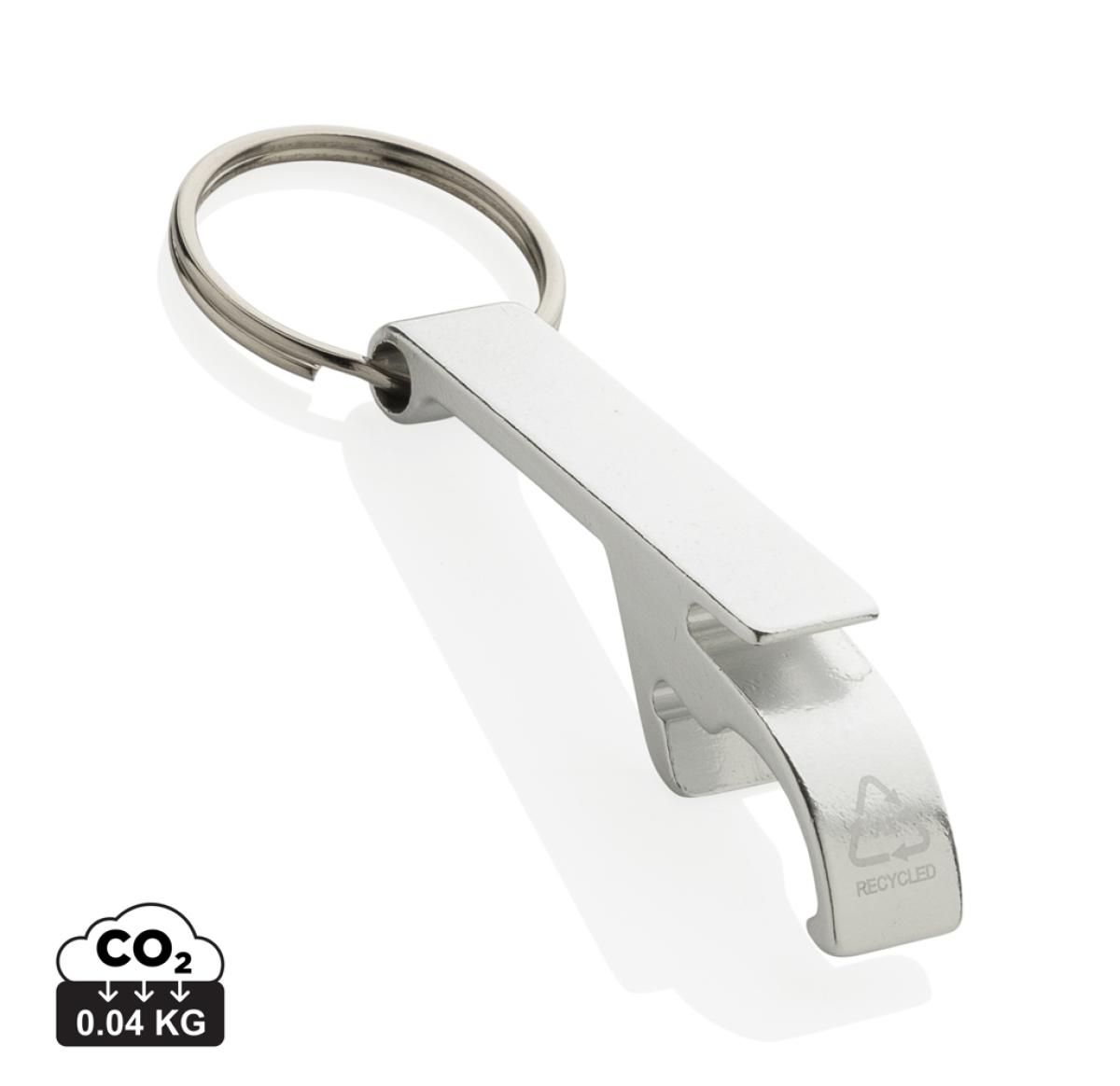 Strong bottle and can opener keychain made with RCS recycled alumimum. Total recycled content: 79% based on total item weight. RCS certification ensures a completely certified supply chain of the recycled materials. Packed in paper bag.