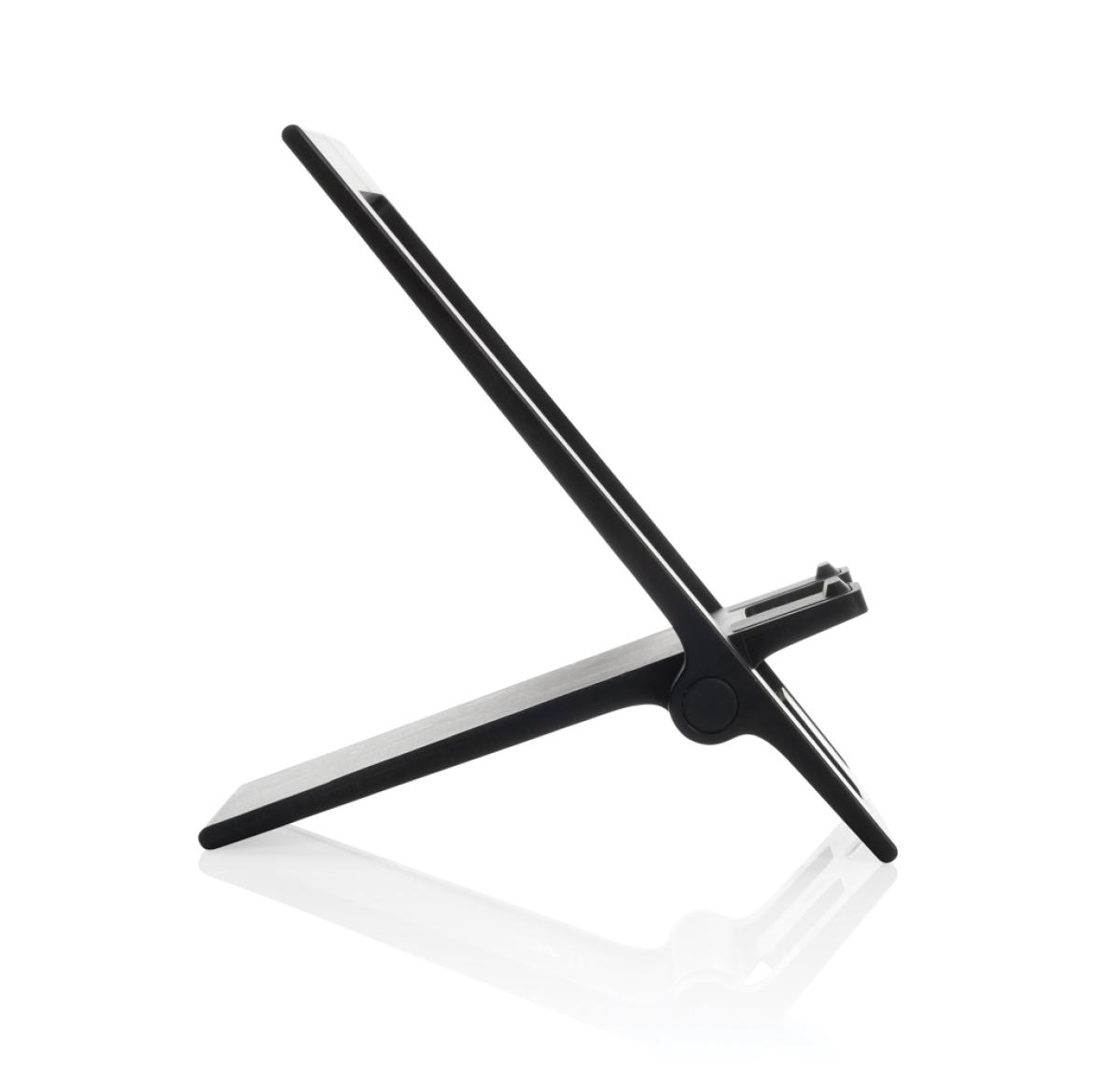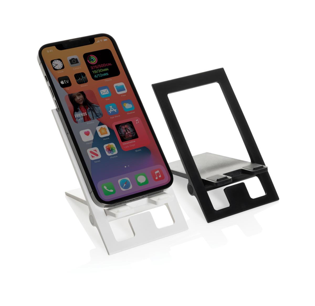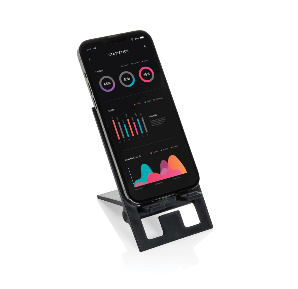 Flat and foldable phone stand made from RCS recycled ABS. The stand comes flat and folded and can be unfolded into a phone stand that can carry all size phones. The stand is strong enough to adjust the viewing angle. With silicon cushioning to keep your phone in optimal condition. Total recycled content: 85% based on total item weight. RCS certification ensures a completely certified supply chain of the recycled materials. Packed in FSC® packaging. PVC Free.