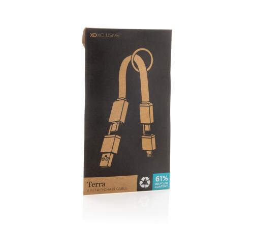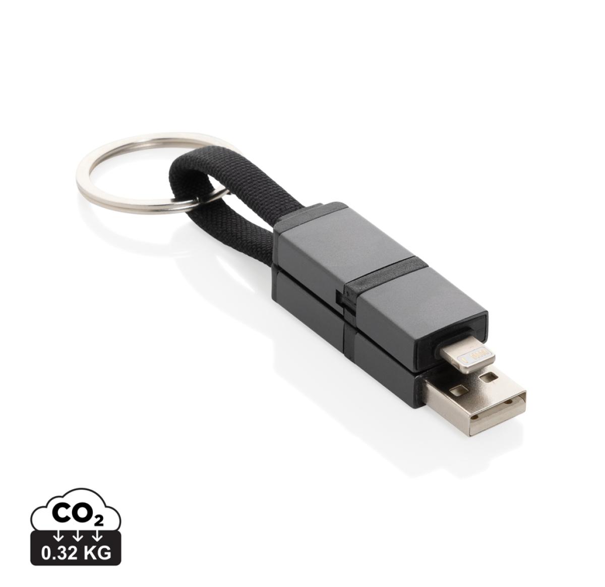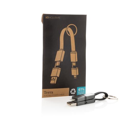 Fast charging 4-in-1 keychain cable made from RCS recycled TPE, recycled aluminium alloy and recycled PET. With USB A and type C input and IOS and Type C output it is suitable to charge many types of items. This small size cable supports a boosting 60W fast charge. Easy to attach to your keychain with included keychain ring. The connectors have magnets inside to keep them together while carrying them. Total recycled content: 60% based on total item weight. RCS certification ensures a completely certified supply chain of the recycled materials. Max supported current 20V/3A; Packed in plastic free envelope packaging. PVC free.