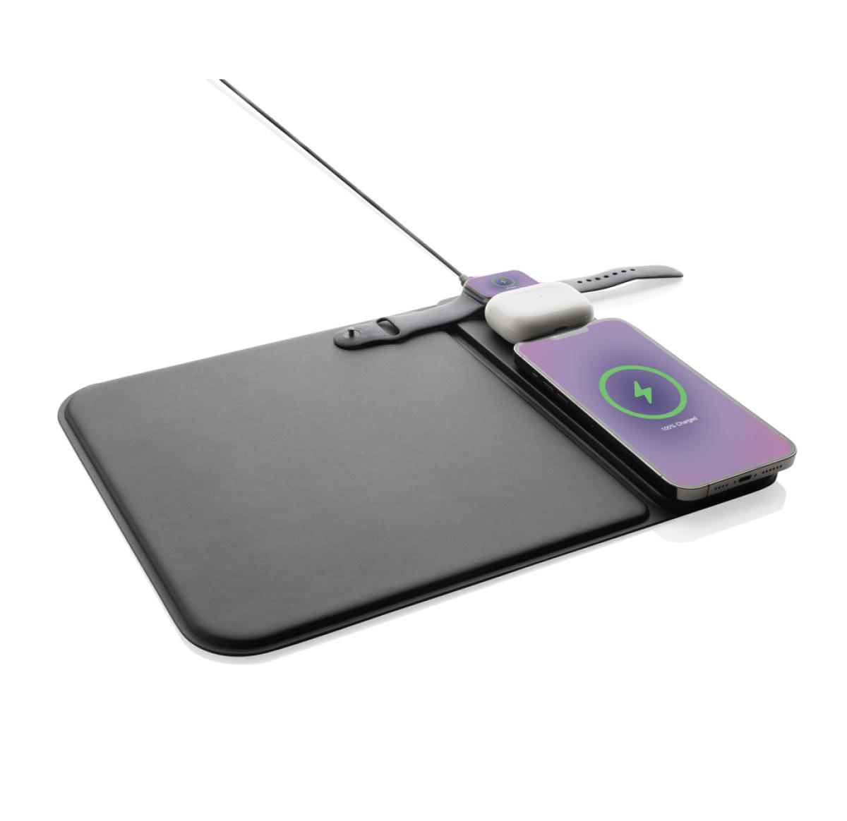 Luxury 3-in-1 wireless charger mousepad made with RCS recycled PU. Total recycled content: 5% based on total item weight. RCS certification ensures a completely certified supply chain of the recycled materials. The wireless charger comes equipped with a magnetic 15W wireless charger and an additional 5W wireless charger suitable for earbuds cases or other small wireless chargeable devices and a 2.5W wireless charger for smartwatches ( Apple watches only). Including RCS certified 120 cm recycled TPE cable. Packed in FSC® mix packaging. Item and accessories 100% PVC free. Input: 9V/3A for optimal use. Output: Phone: 9V/1.1A; 9V/1.67 A/(15W), Earbuds: 5V/1A (5W), Watch: 5V/0.5A.