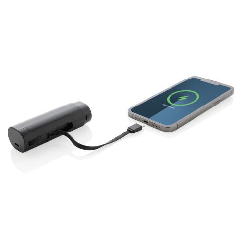 Unique design powerbank that is designed to stimulate recycling of the battery at the end of the products life cycle. Simply open the powerbank and remove the a-grade battery for safe and responsible battery recycling. The 5000 mah powerbank comes with an integrated type C cable that you can easily connect to your device to start charging direct. The cable can also be used to charge the powerbank itself. With one additional type C port to connect your own charging cable. Made with recycled ABS and recycled TPE. Total recycled content: 30% based on total item weight. RCS certification ensures a completely certified supply chain of the recycled materials. Packed in FSC® kraft packaging. PVC Free. Input: 5V/2.1A Output 5V/2.4A.