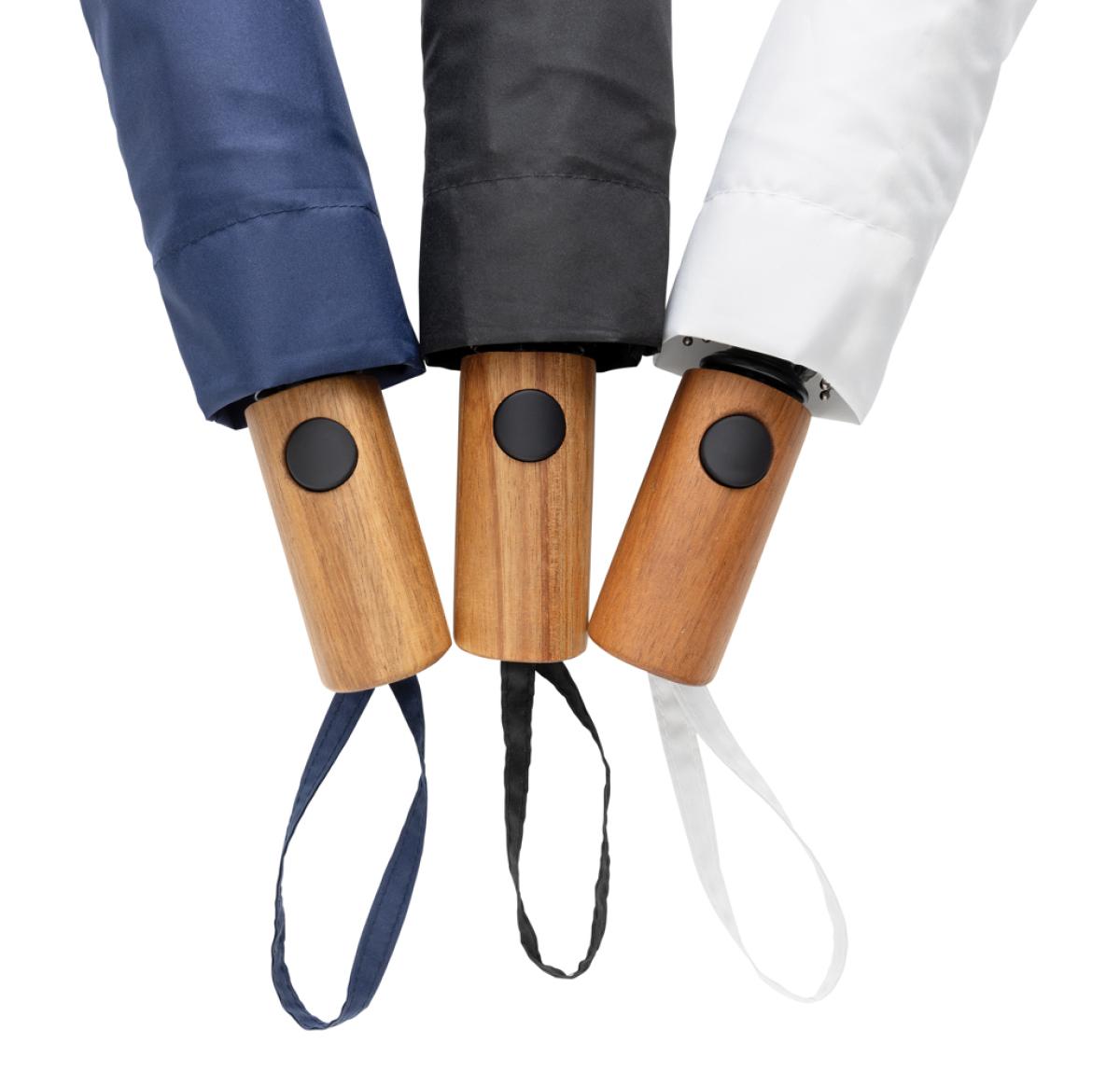 This compact 3-section auto-open mini umbrella is ideal for keeping in your bag or car for unexpected weather. Featuring a metal frame, fibreglass ribs and a beautiful FSC® certified acacia wooden handle. The canopy is made of recycled polyester which includes an AWARE™ tracer for genuine recycled materials. 2% of proceeds of each Aware™ product sold will be donated to Water.org. Please note that the acacia wooden handle might have some differences in colour and texture. This does not compromise its functionality or durability.