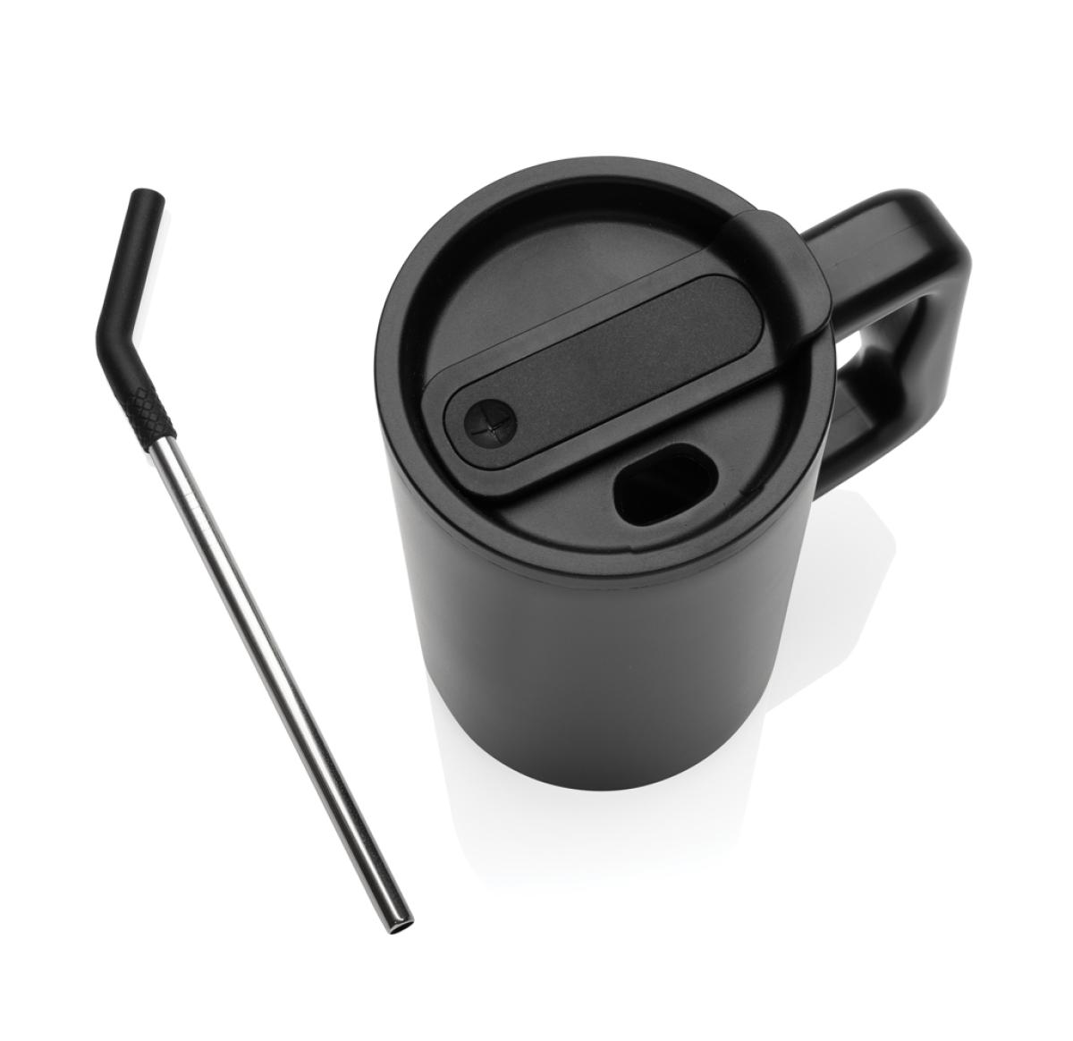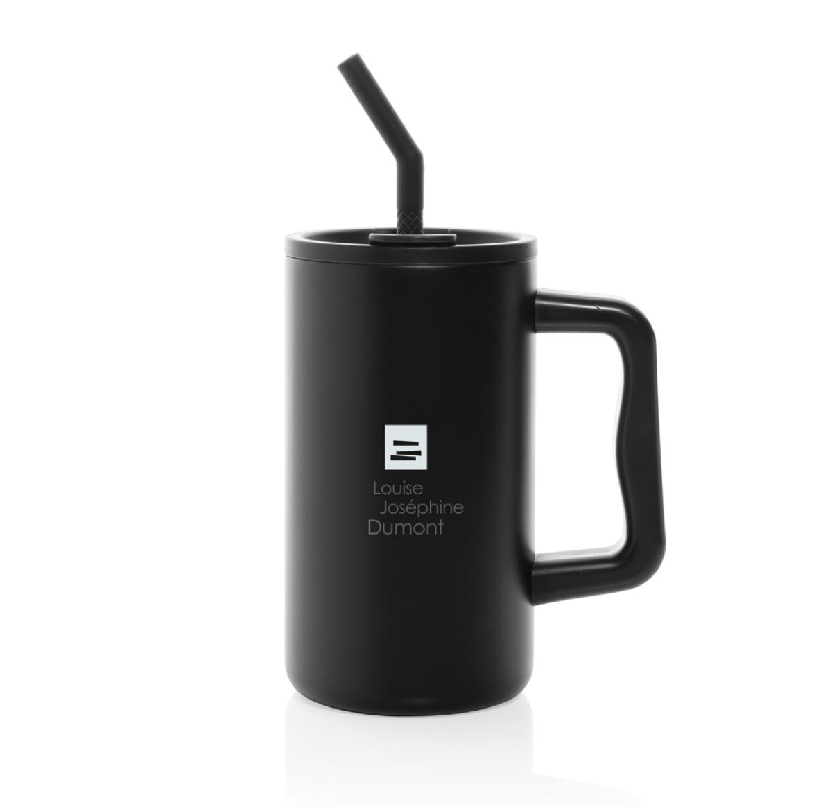Indulge in the robust embrace of our generously sized 800ml mug – substantial and perfect for on your office desk. Its sturdy handle and broad base make it an ideal companion for your daily water intake in the office. Crafted from durable recycled stainless steel, this mug is designed to meet your hydration needs.This hefty, double-walled, vacuum-insulated mug comes equipped with a secure lid, straw, and a silicone straw tip. Versatile enough for both piping hot and ice-cold beverages, the screw-on lid offers a dual function – a convenient drinking spout or the option to use a straw. For optimal care, we recommend handwashing this substantial mug