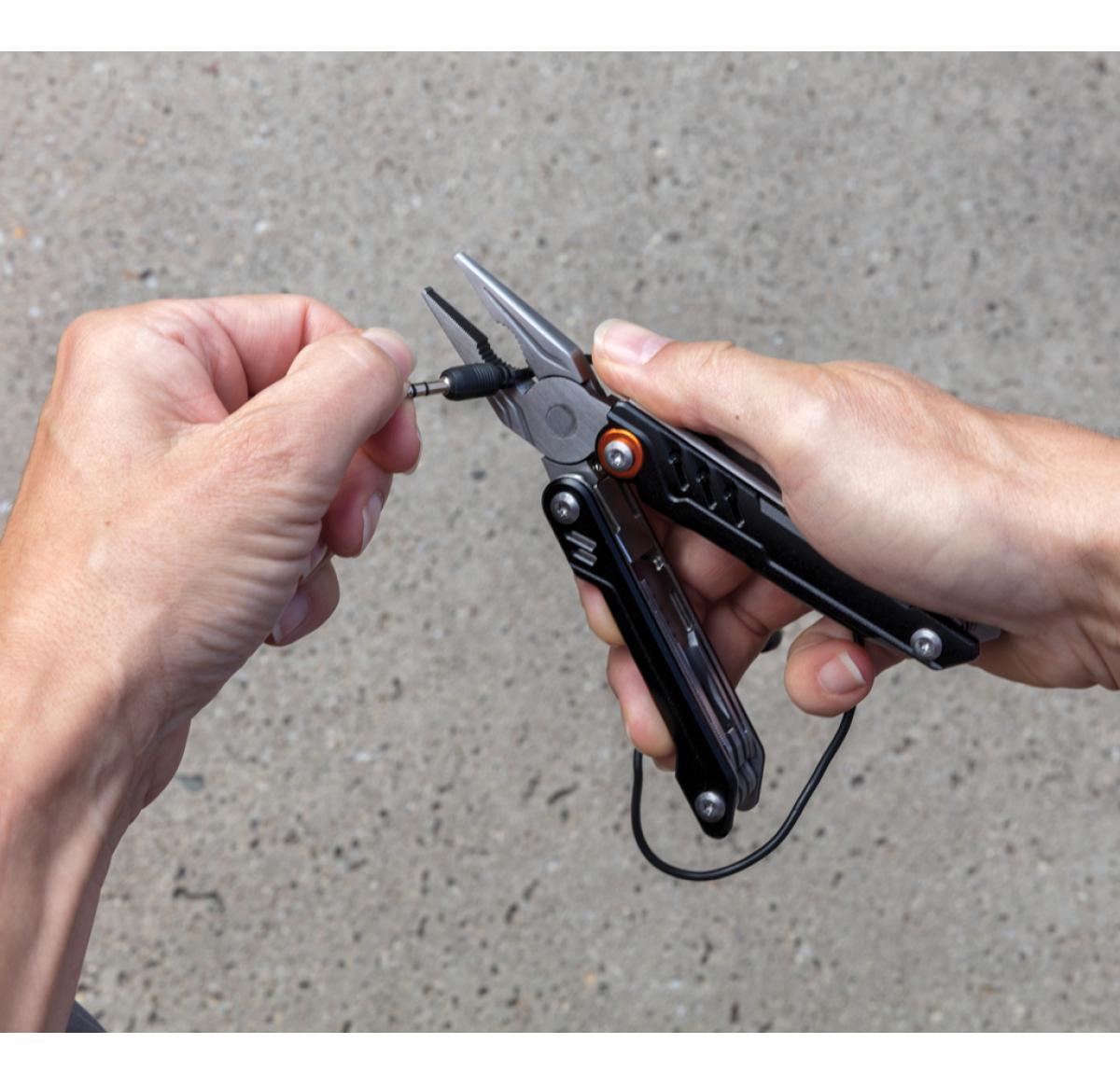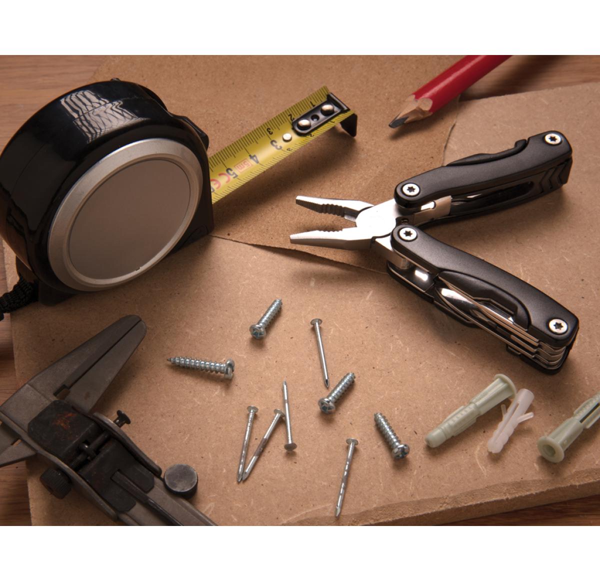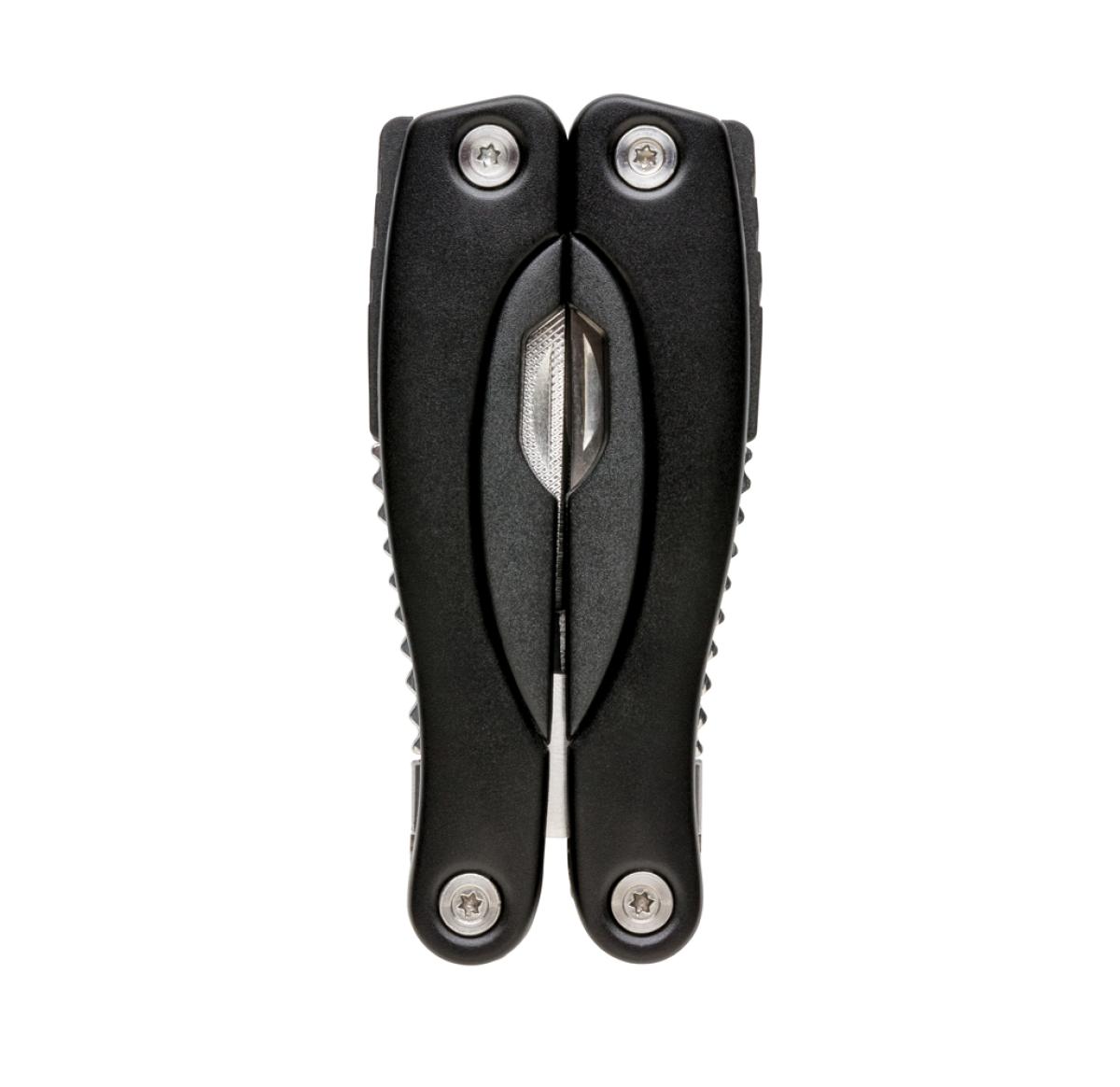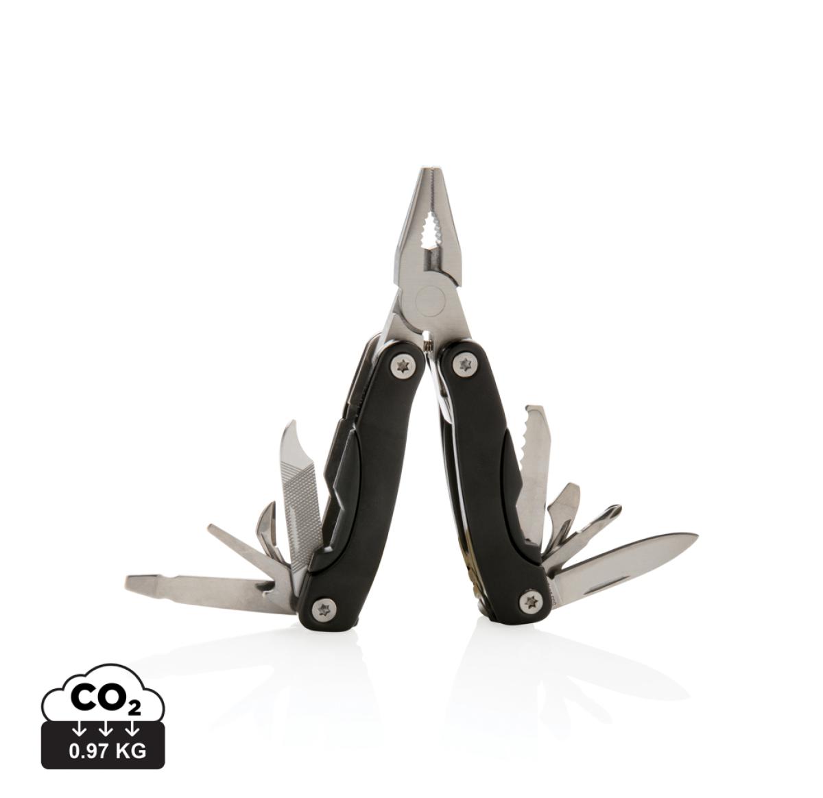 13 functions, stainless steel multitool with aluminium anodised handle. Including black pouch.