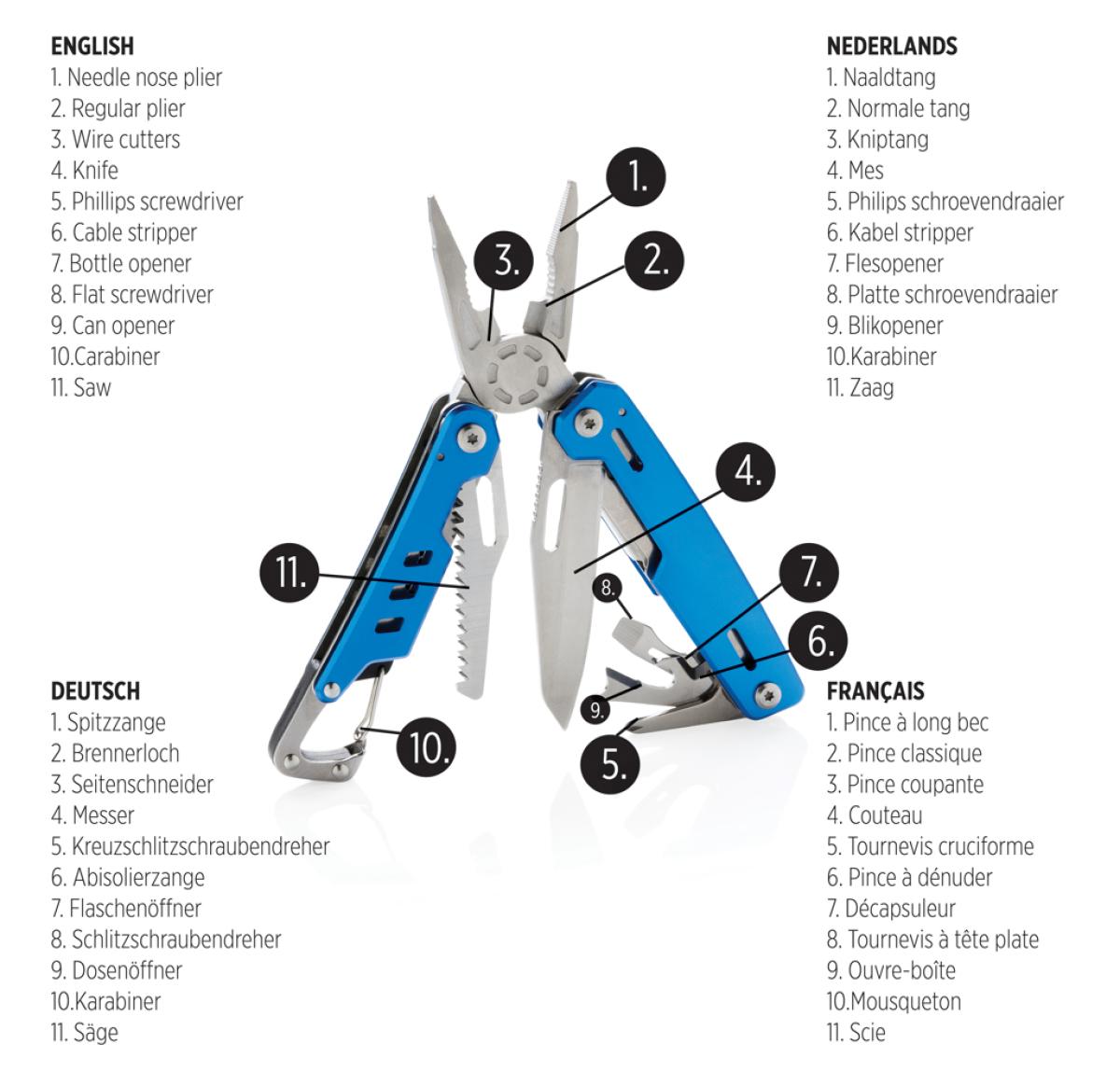Strong and durable multitool with 11 functions. With aluminium case and stainless steel tools. Tools include: needle nose plier, regular plier, wire cutters, knife, phillips screwdriver, flat screwdriver, saw, can opener, bottle opener, wire stripper, car