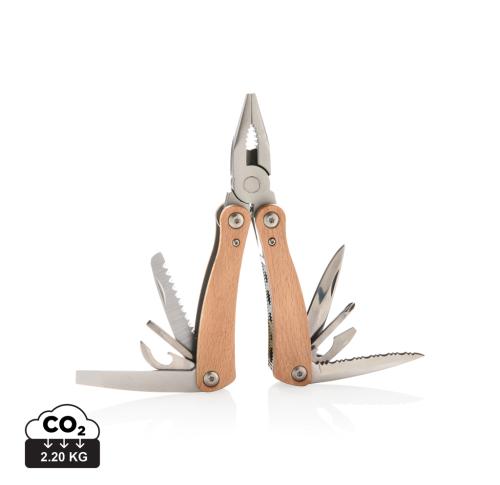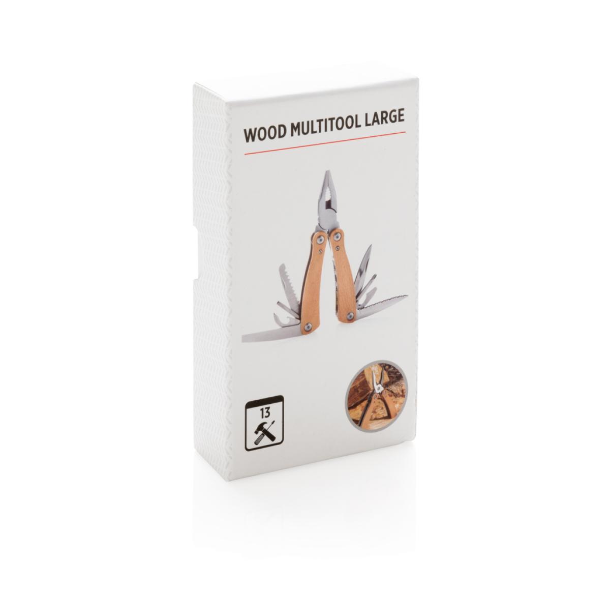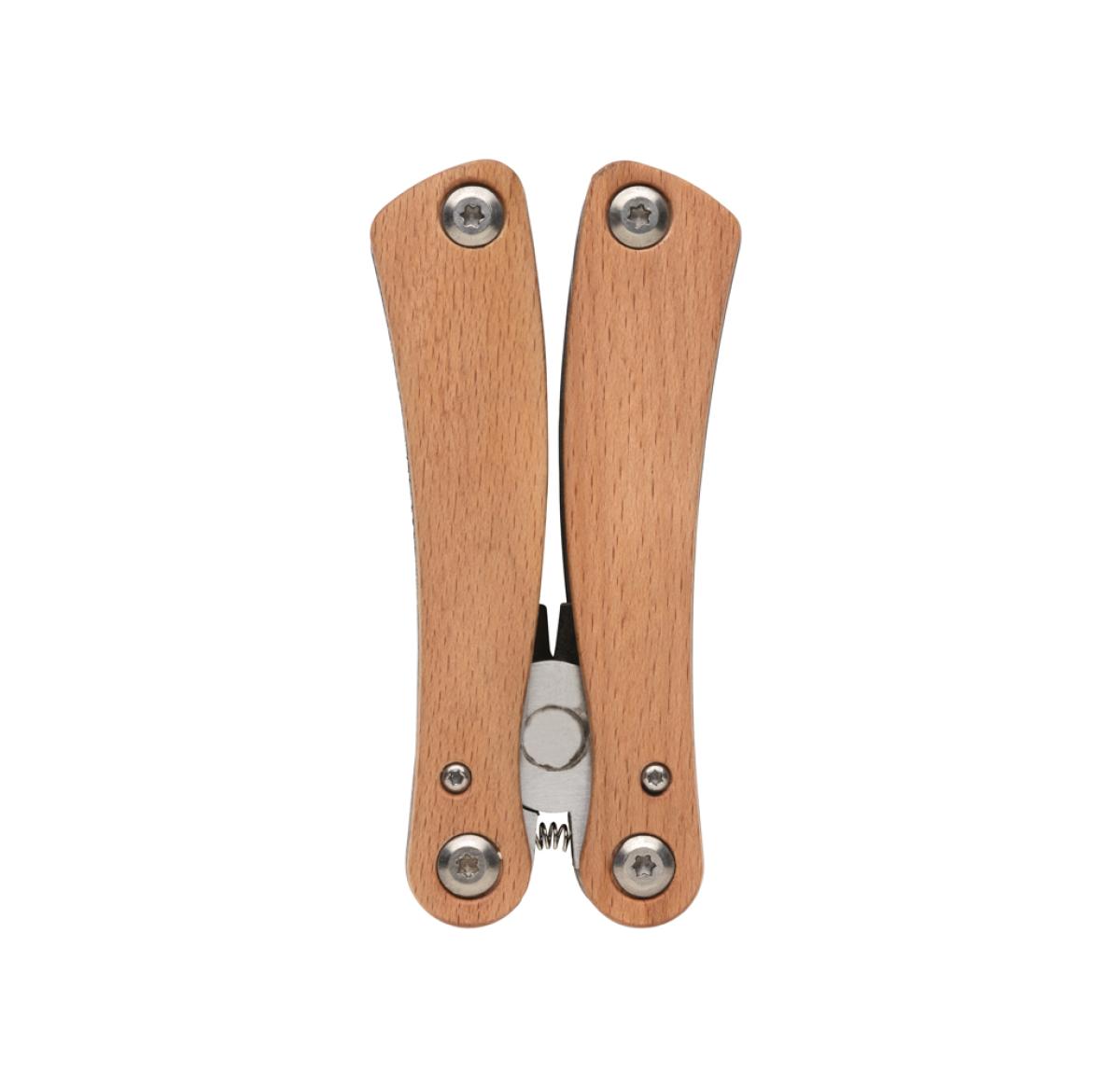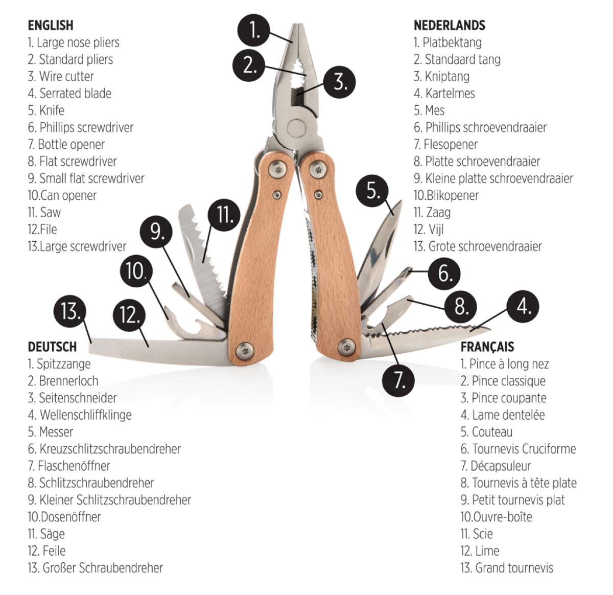 Strong and durable multitool with 13 functions. With beech wood case and high quality stainless steel tools. Tools include: Long nose pliers, standard pliers, wire cutters, serrated blade, bottle opener, large flat screwdriver, phillips screwdriver, knife