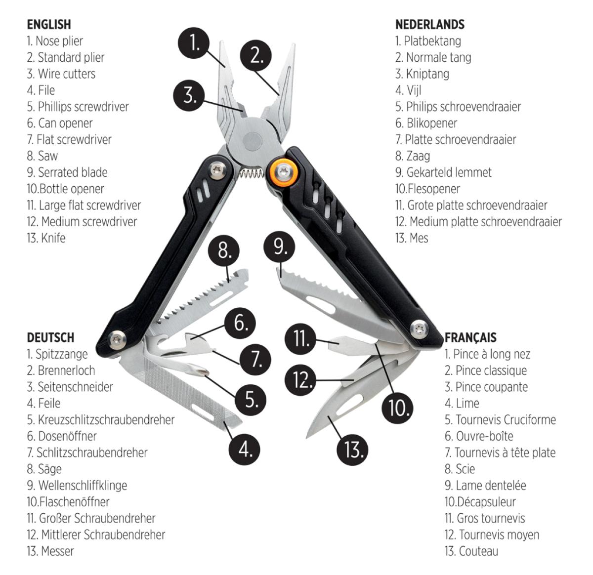 Ultra-strong tool with 13 functions. Packed in luxury gift box including high quality 1680D pouch. Aluminium material body and stainless steel tools. Tools included: Long nose pliers, standard pliers, wire cutters, serrated blade, bottle opener, large fla