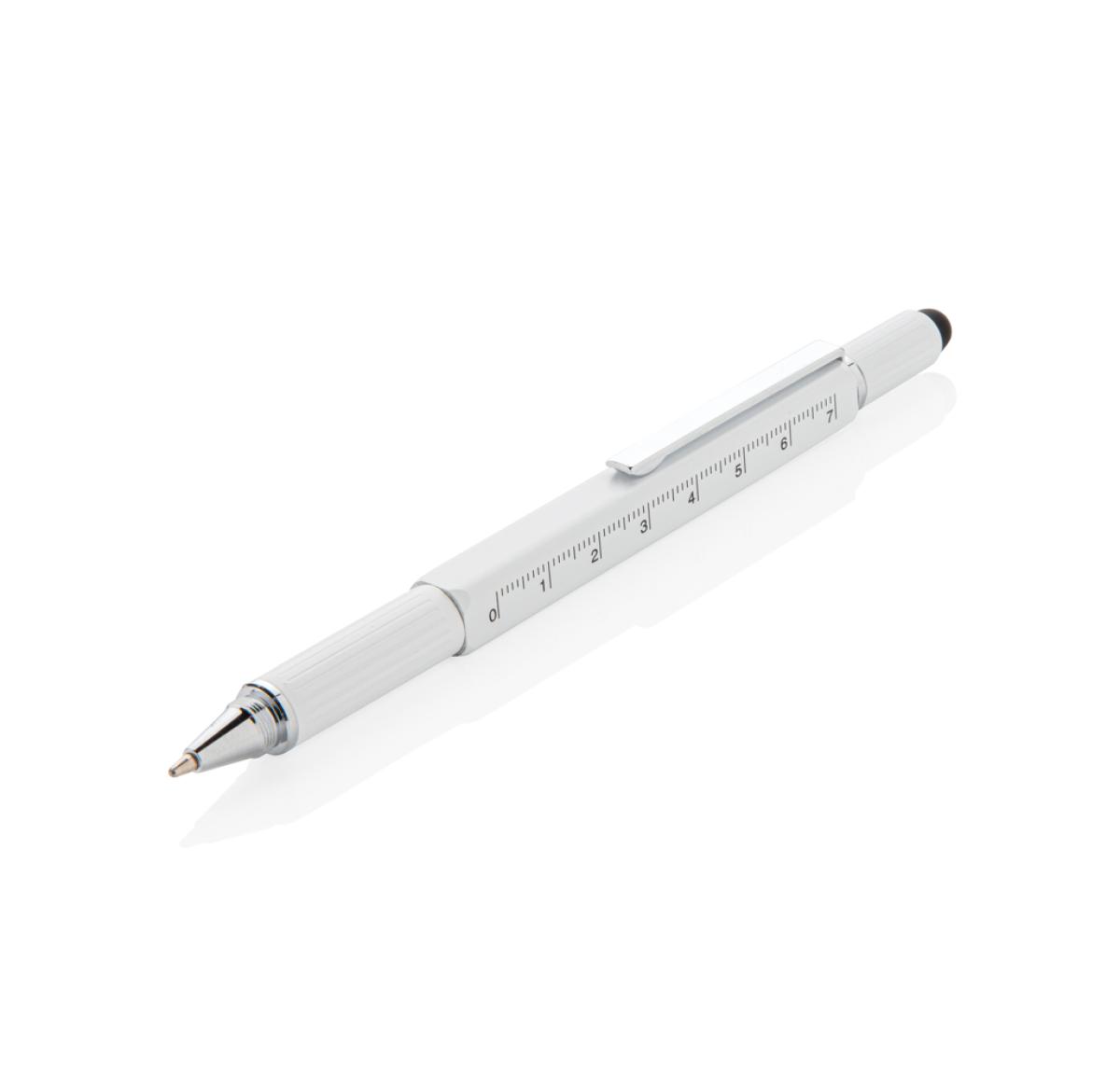 Multifunction pen with ruler (7cm) , spirit level, screw driver, stylus tip and ballpoint with blue writing ink (up to 400m) Made out of high quality brass material with aluminium clip.