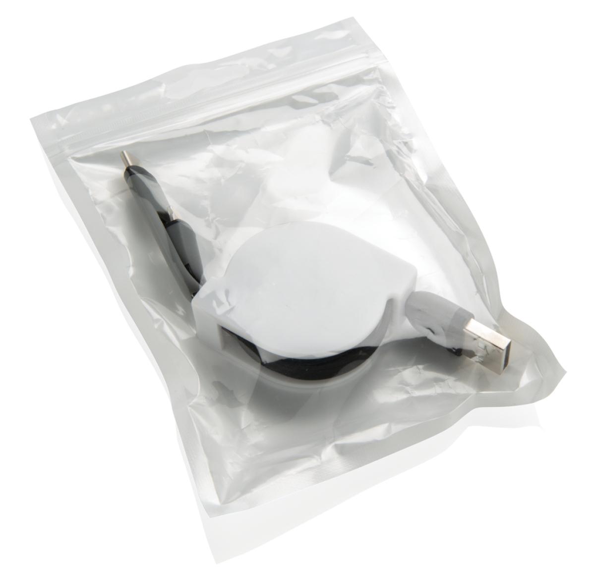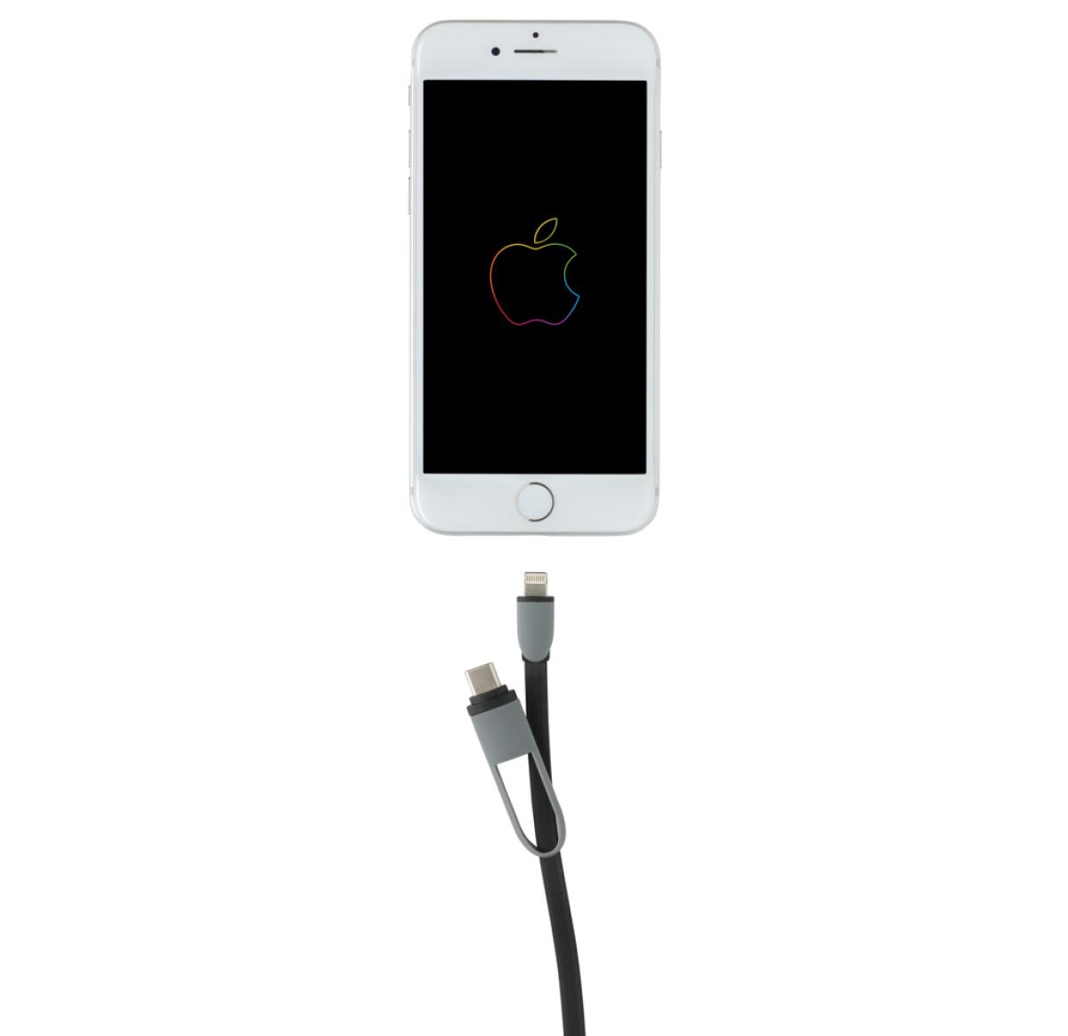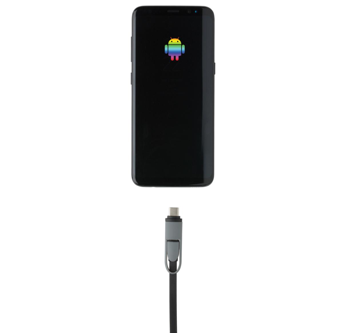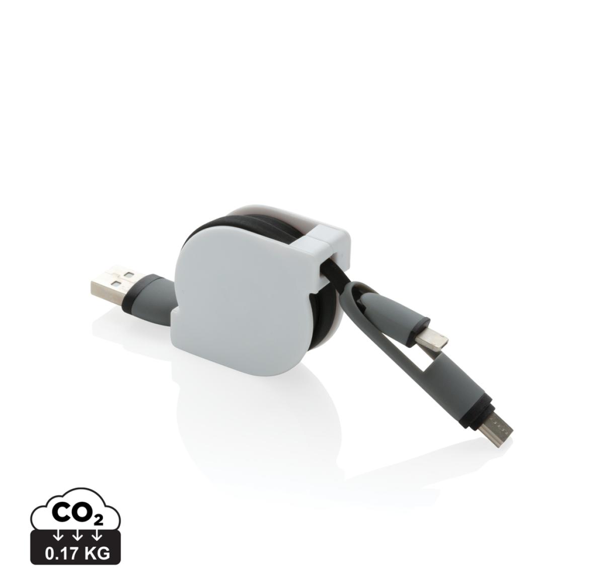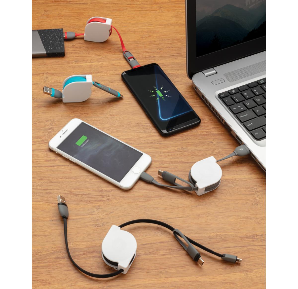 Compact and retractable 3 in 1 charging cable with type C and double-sided connector for IOS and Android devices that require micro usb. Because of the retractable mechanism the 100 cm long flat cable can easily be taken anywhere without it getting tangle