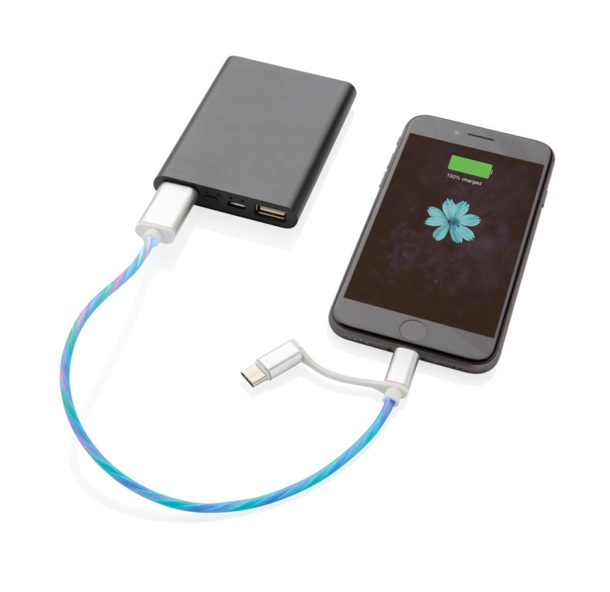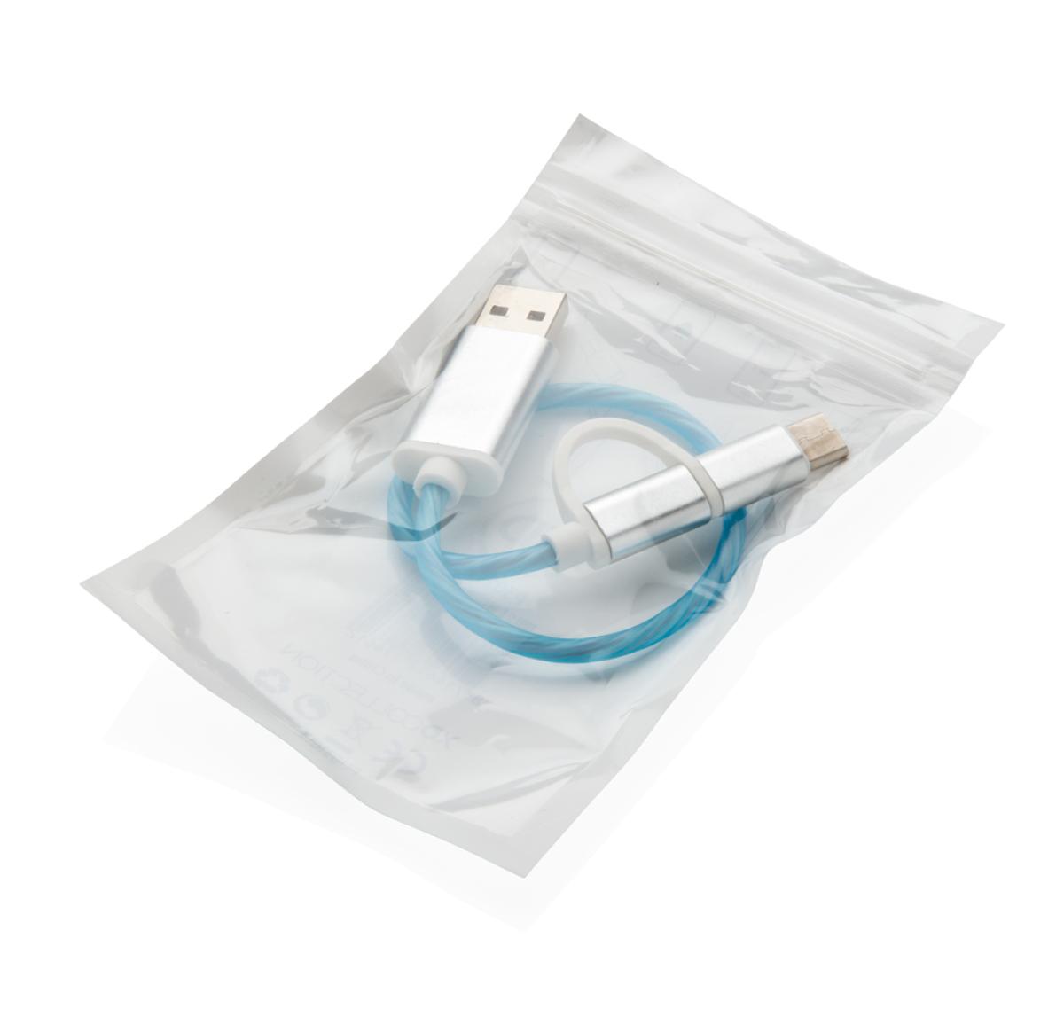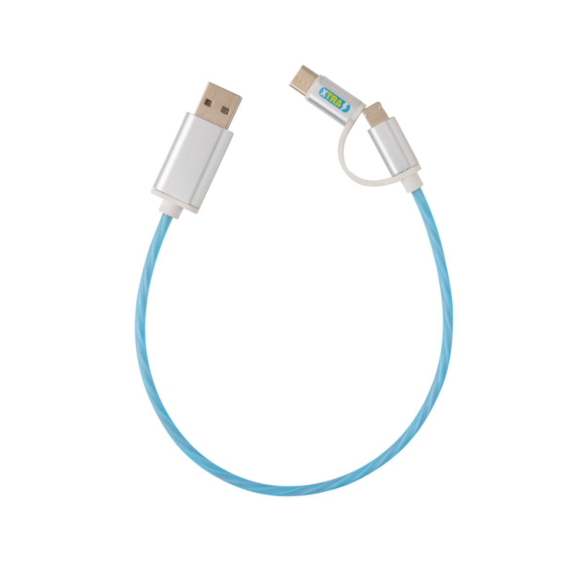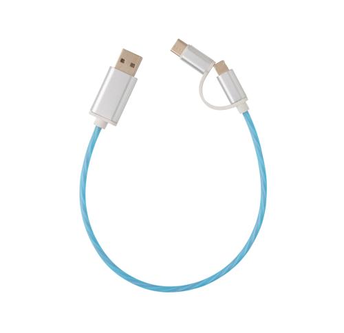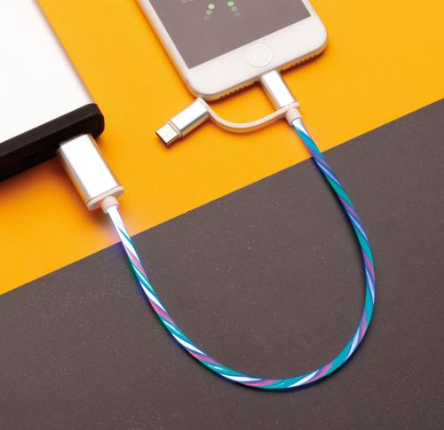 Modern 3 in 1 cable with flowing light effect when charging. With type C and double-sided connector for iOS and Android devices that require micro USB. TPE material cable with connectors made out of durable aluminium. Suitable for charging. Length 30 cm.