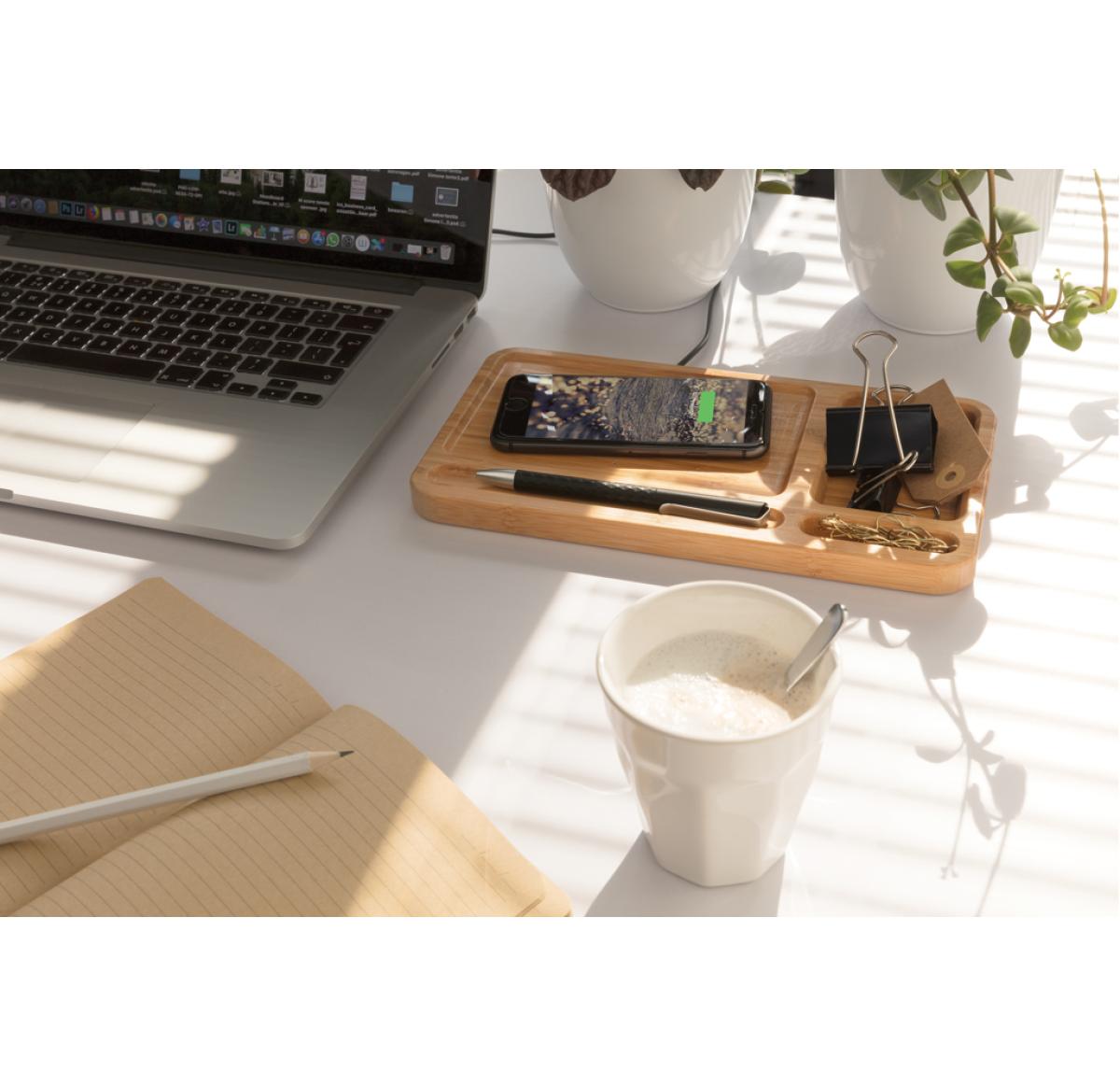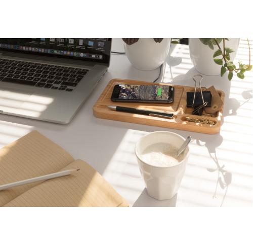 The perfect item for on your desk or table! This bamboo desk organiser allows you to keep your desk tidy and charge your phone without any wires. Including 150 cm micro USB cable to connect the charger to a power source. 5W wireless charging. Input DC 5V/