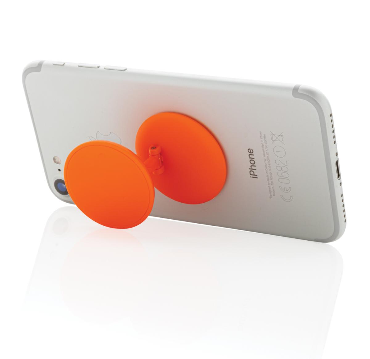 Multi-function phone stand, holder and cord winder. Comes with adhesive backing to easily attach to your mobile device. Perfect for taking selfies, watching videos or facetiming your friends. Made out of PP material. Registered design. Including additiona