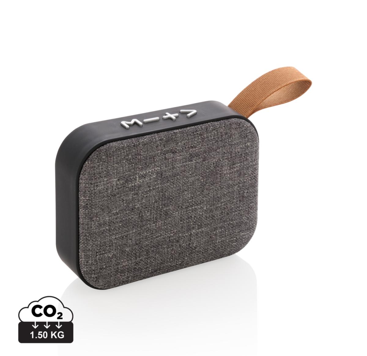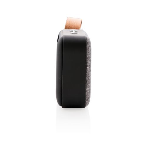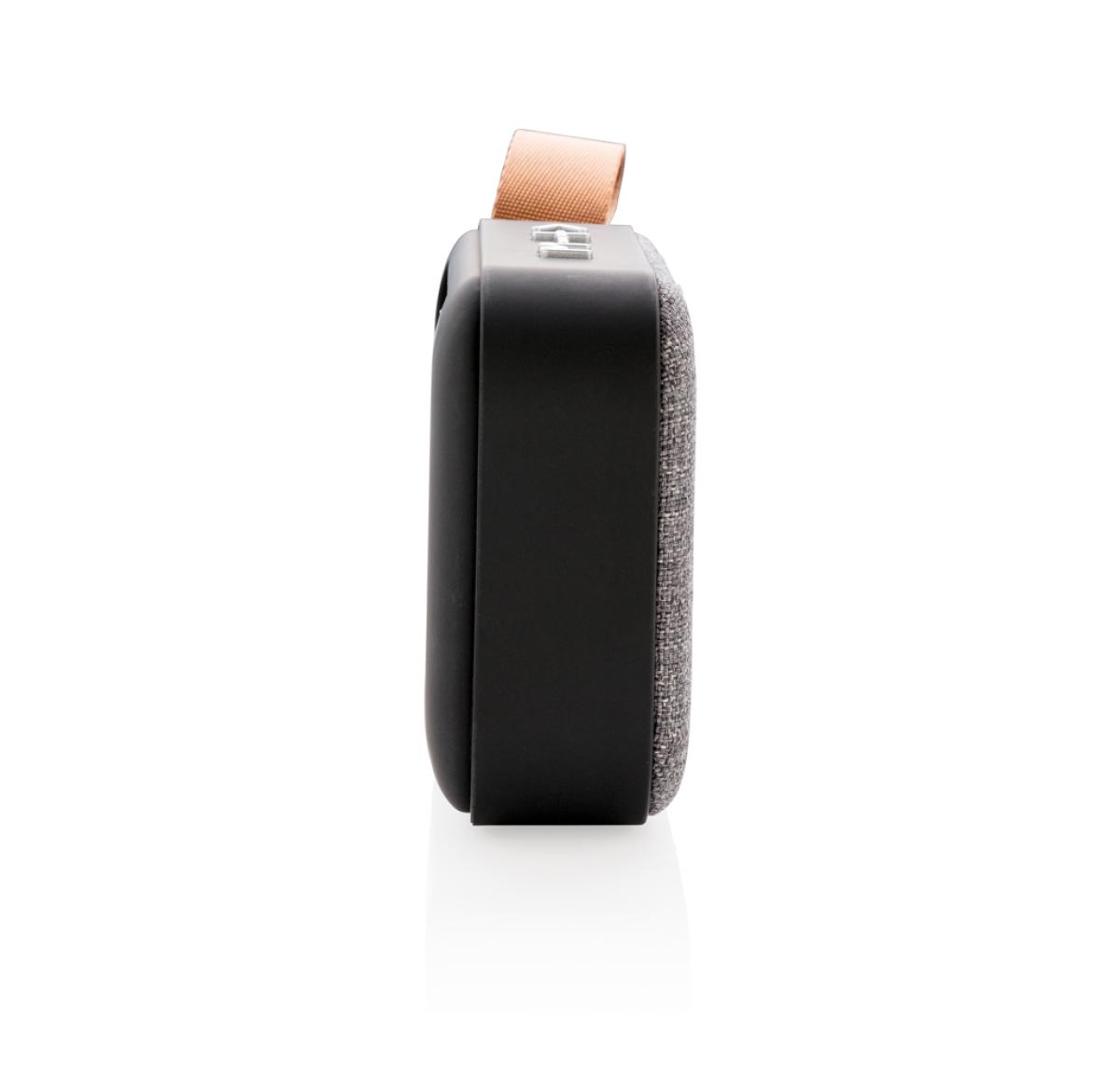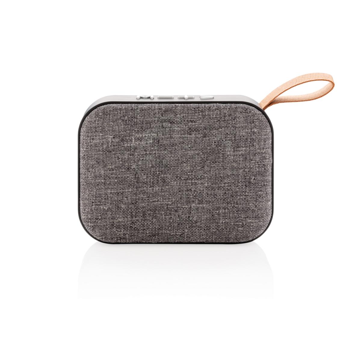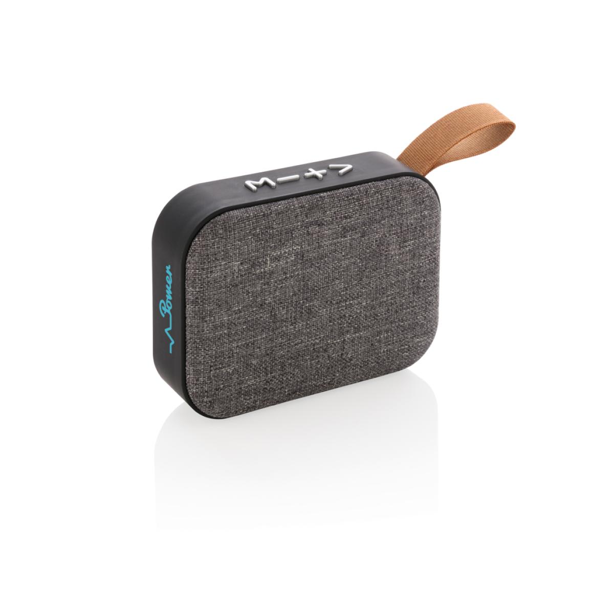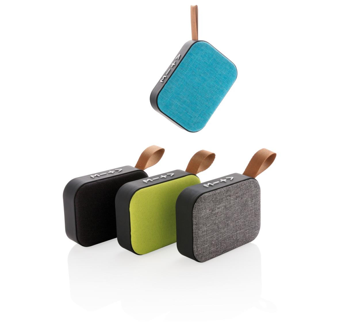 Wireless 3W speaker. ABS body with soft touch finish and fabric grill, the bottom of the speaker has rubber strips for improved sound quality and grip. The 300 mAh battery allows for a playing time up to 3 hours on one single charge and connection distanc
