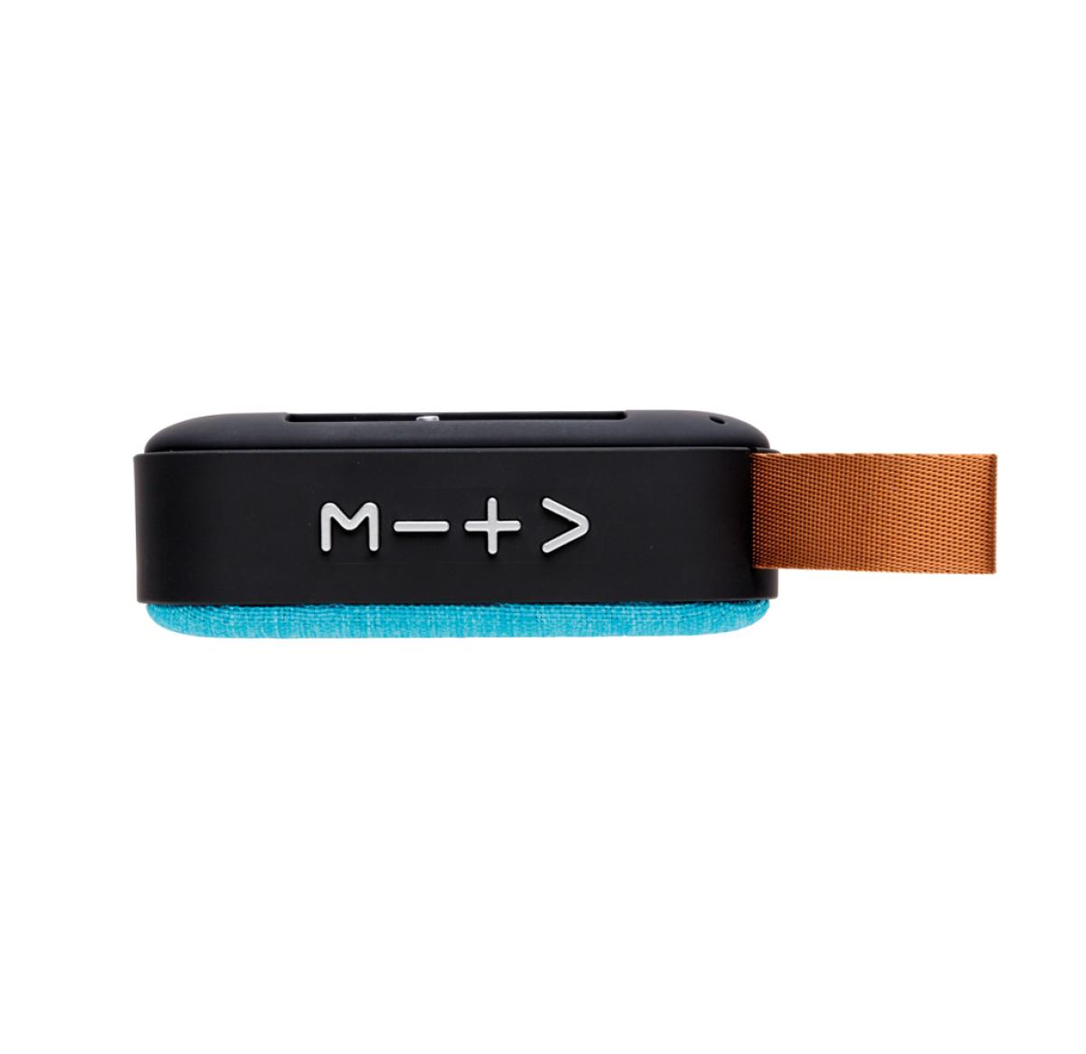 Wireless 3W speaker. ABS body with soft touch finish and fabric grill, the bottom of the speaker has rubber strips for improved sound quality and grip. The 300 mAh battery allows for a playing time up to 3 hours on one single charge and connection distanc