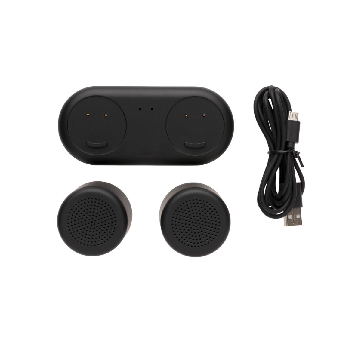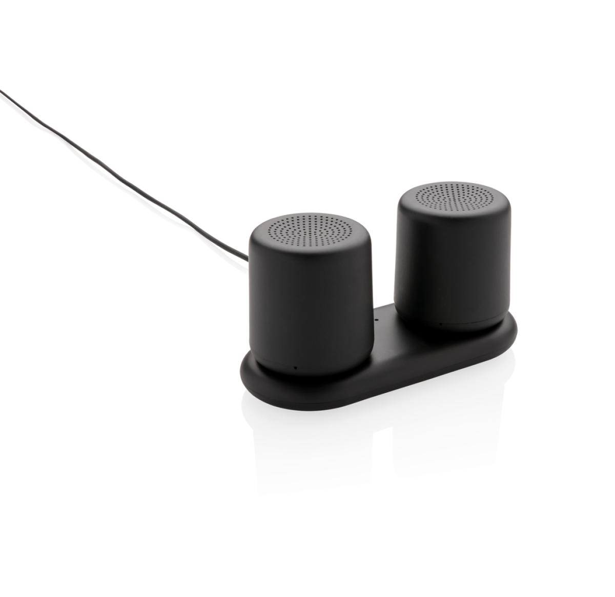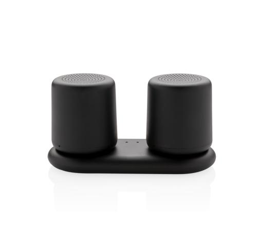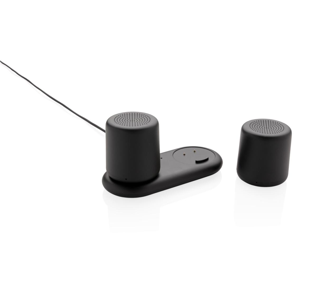 2X 3W speakers that can be paired for great stereo sound. Place the speakers anywhere you like for a great sound experience. The ABS speakers can be charged by simply placing them on the charging base. No need to connect any wires! Both speakers come equ