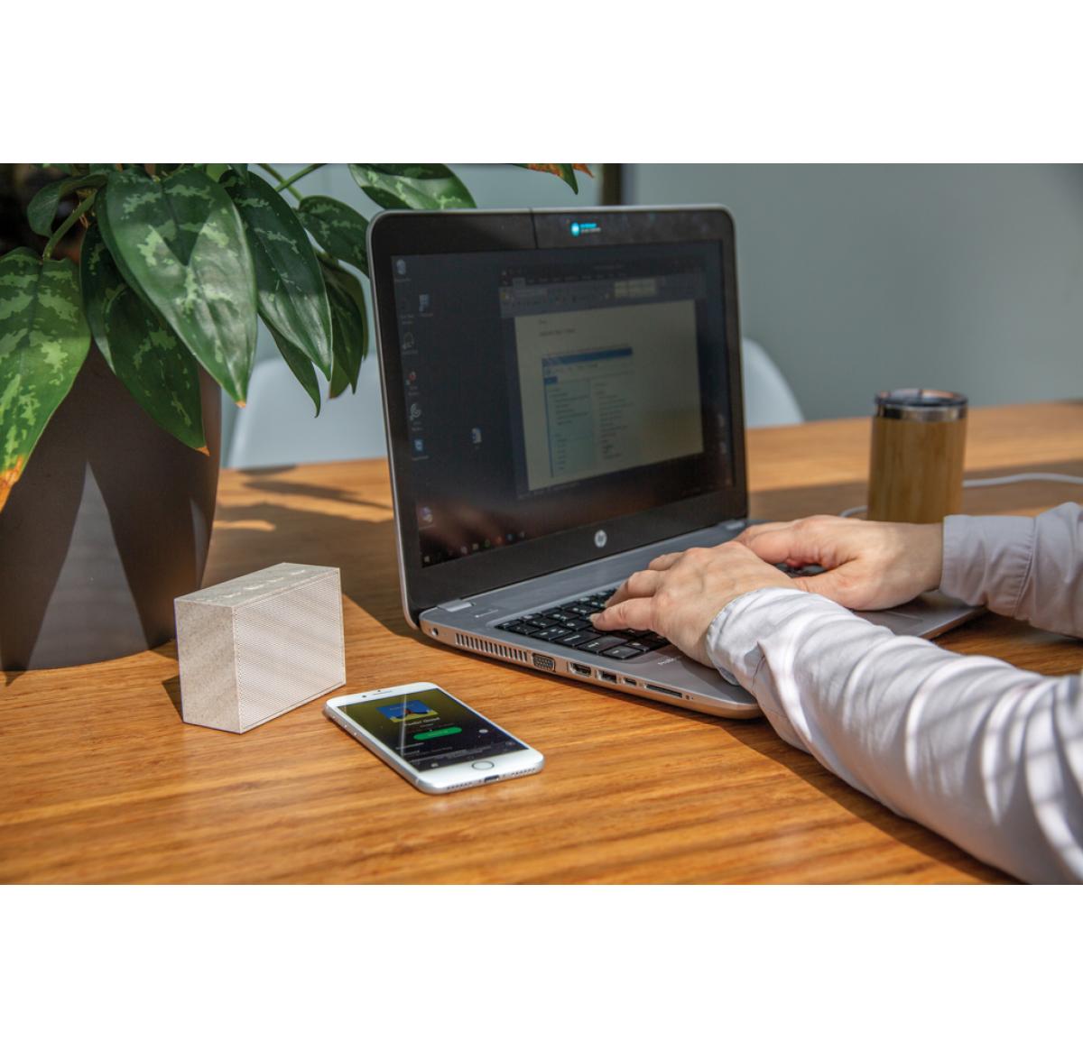 Small but powerful 3W wireless speaker made out of a natural wheat fiber (35%) mixed with ABS that can be taken anywhere you go to play your favorite music. With 500 mah battery that allows a playing time up to 4 hours on one single charge and operating d