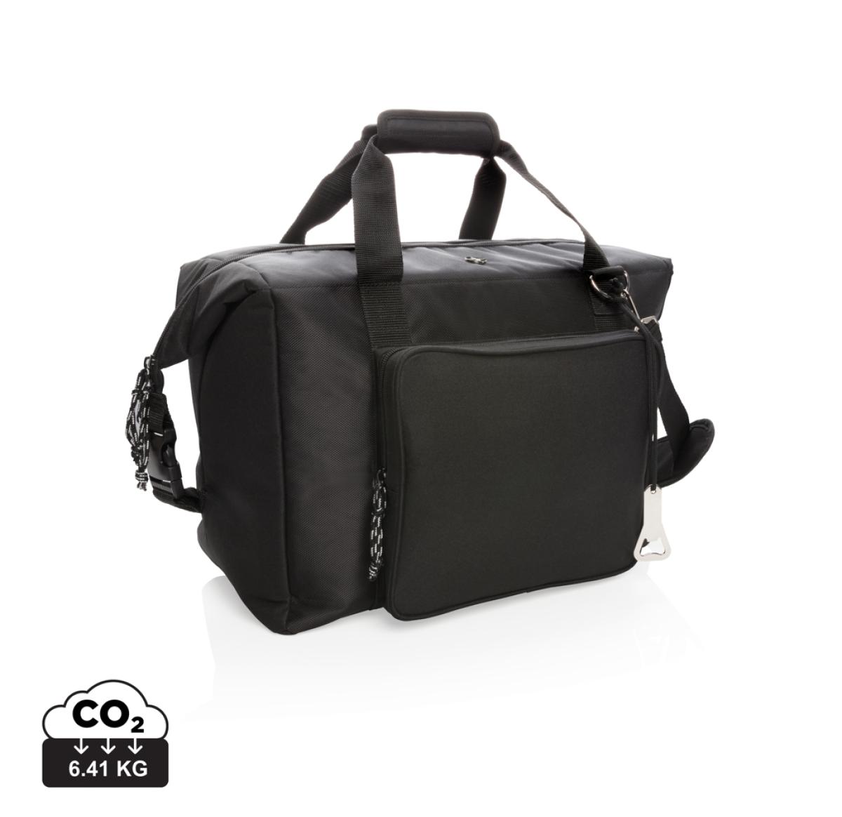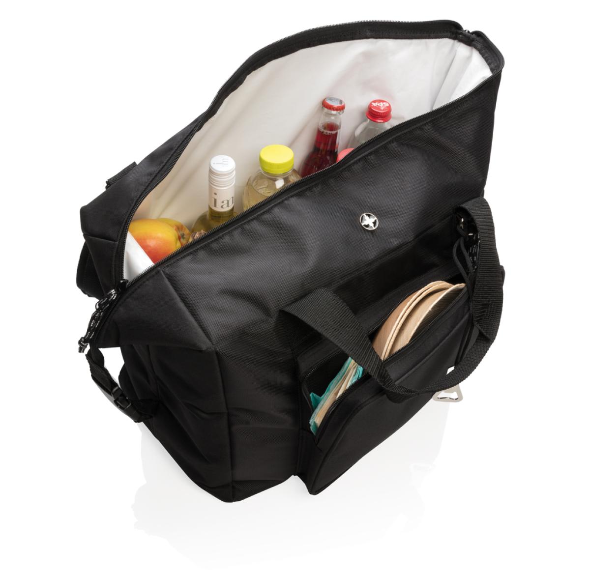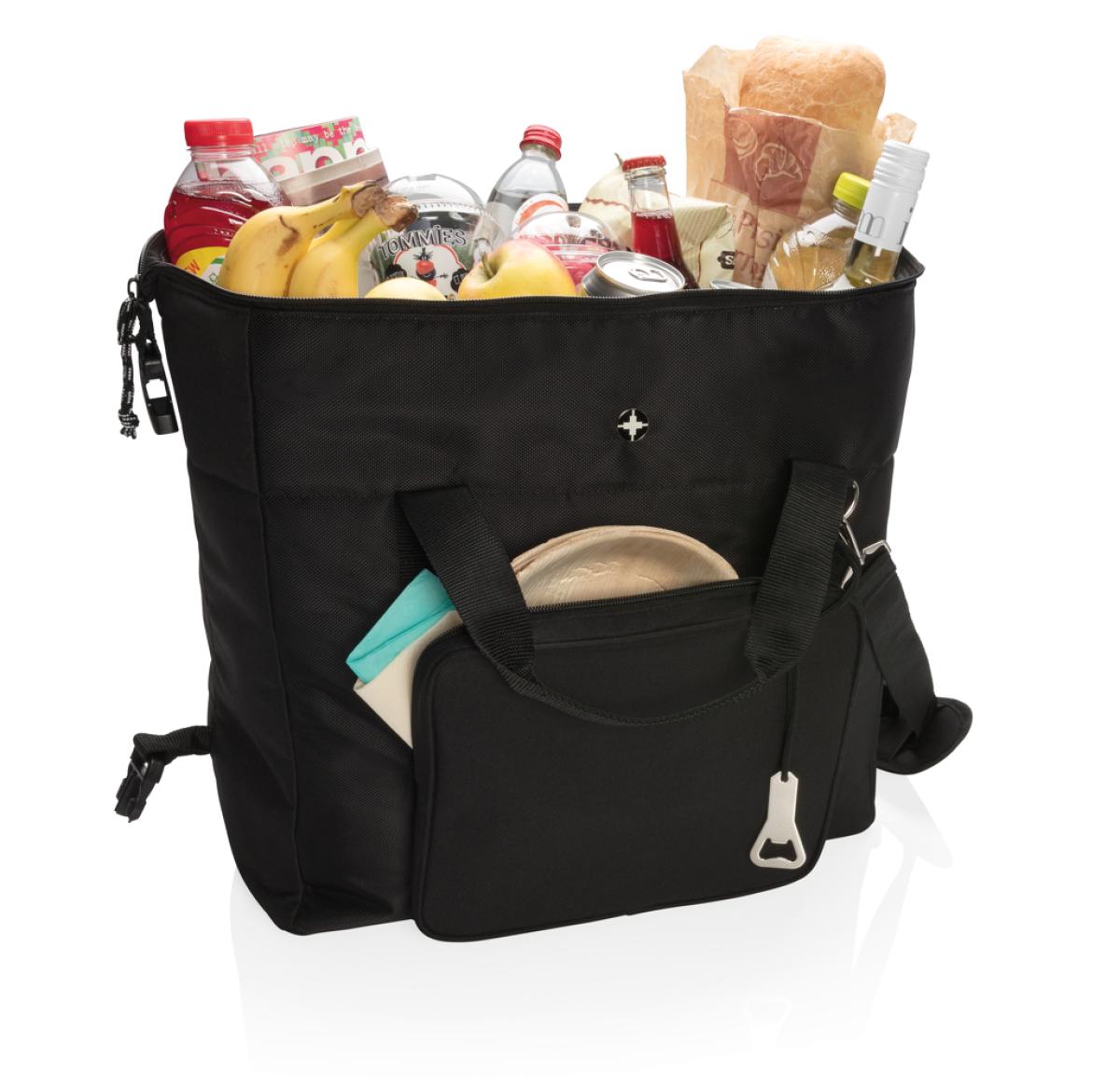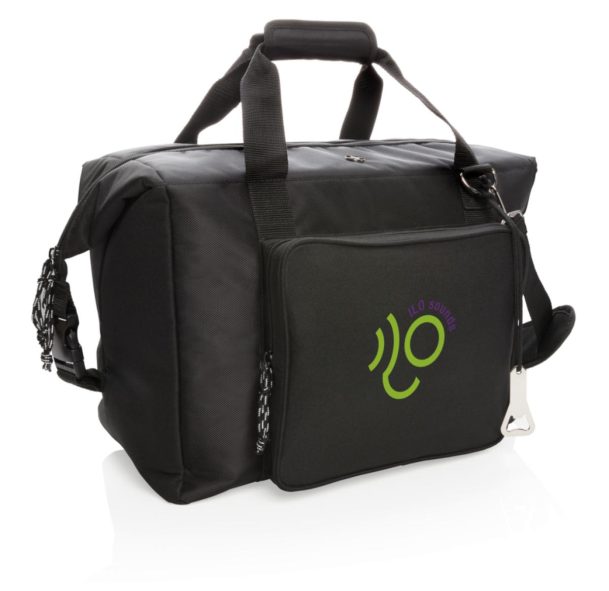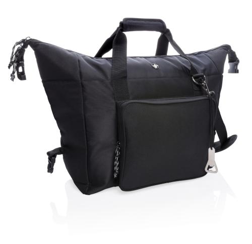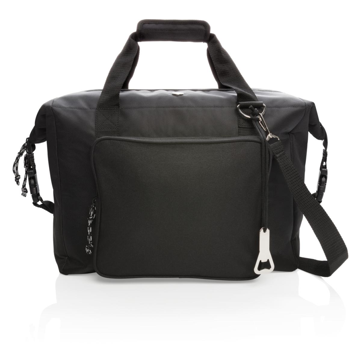 Deluxe 1680D and 600D polyester cooler tote bag with extra-large zipped main compartment and zipped front pocket. Can be easily transformed to a cooler duffle bag by closing the side straps. Huge 40L storage space; fits up to 10 x 1.5L bottles or 52 cans.