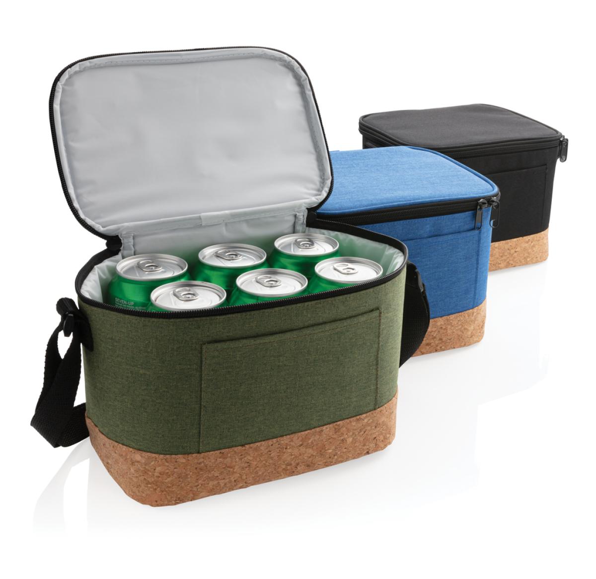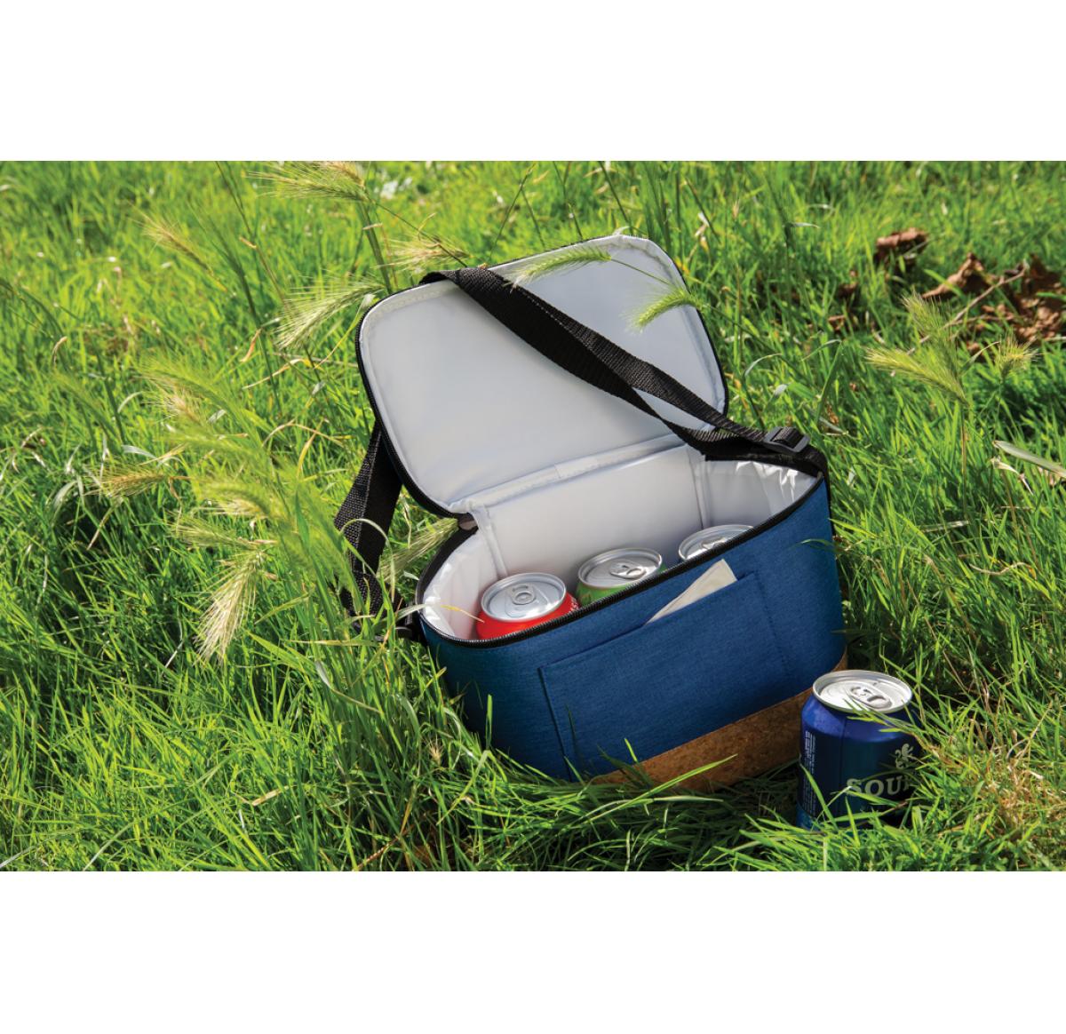 Keep your food and drinks cool until you are ready to use them in this beautiful two tone cooler bag with cork detail. This cooler bag can fit up to 6 cans. Including shoulder strap for versatile carrying options.