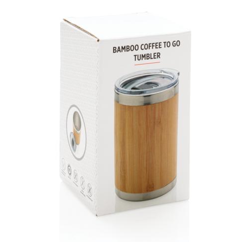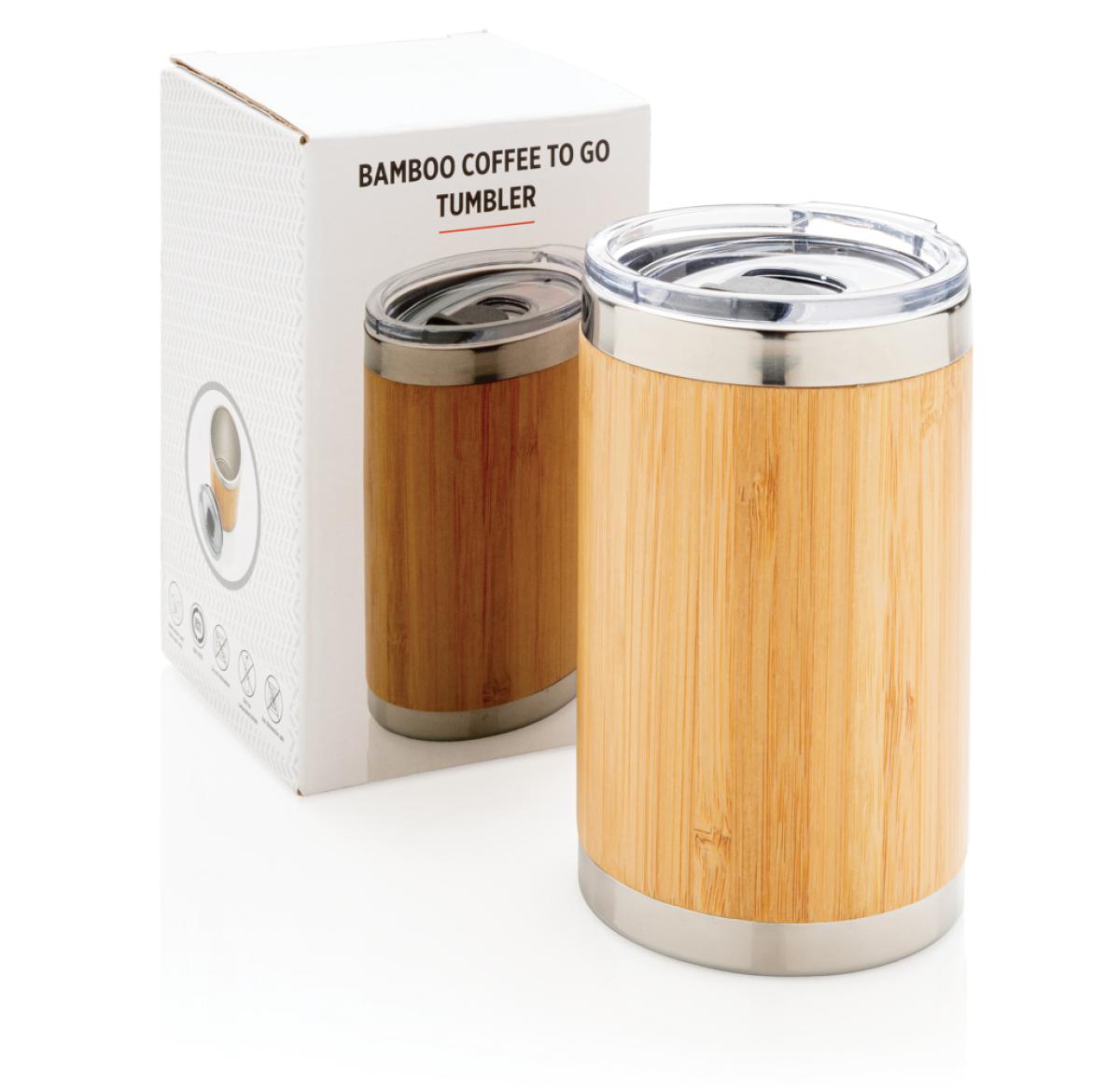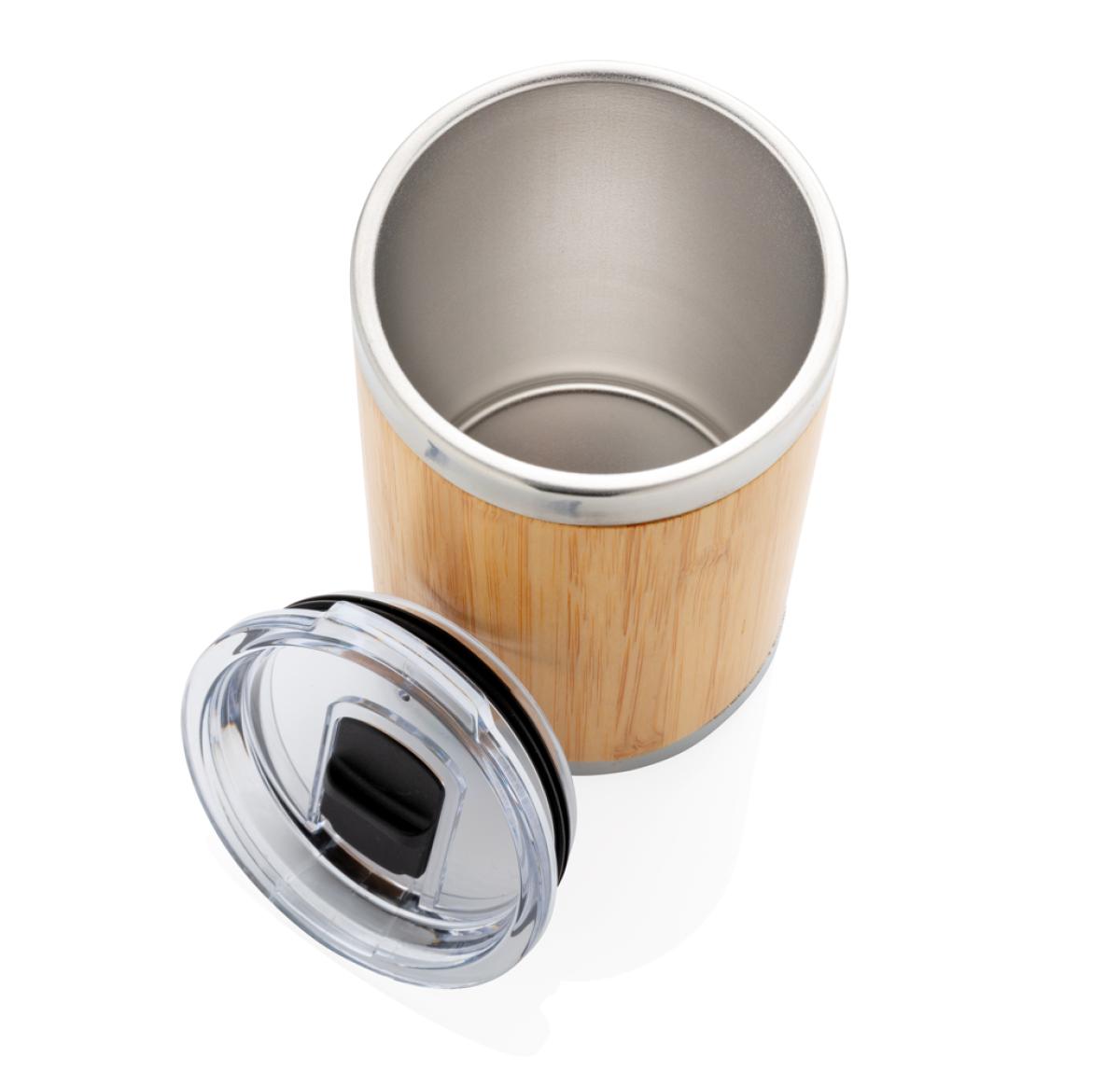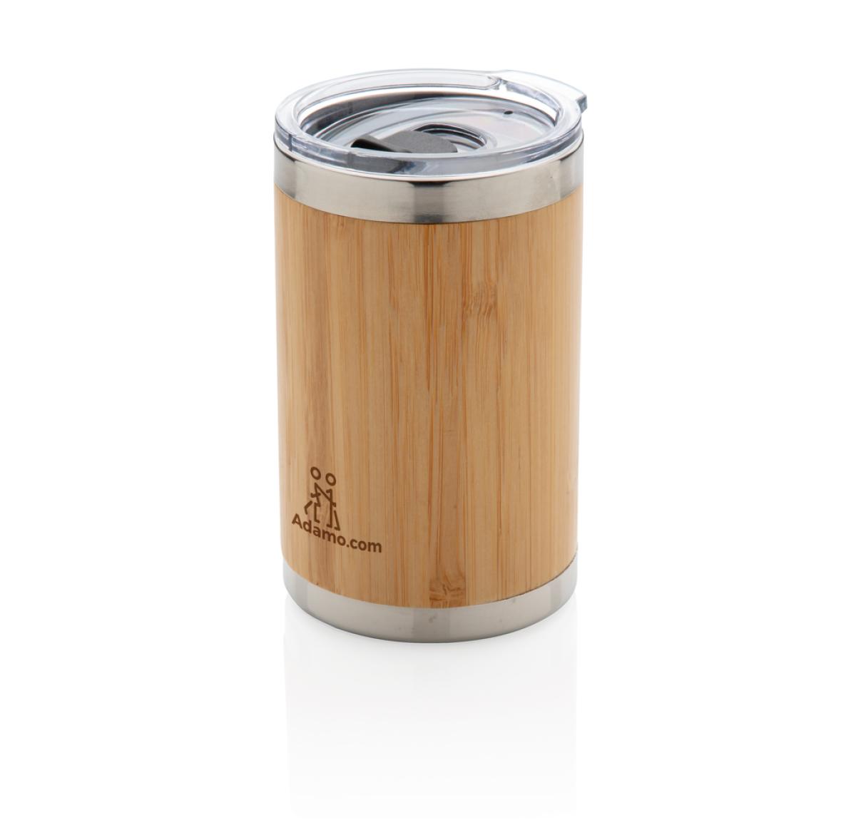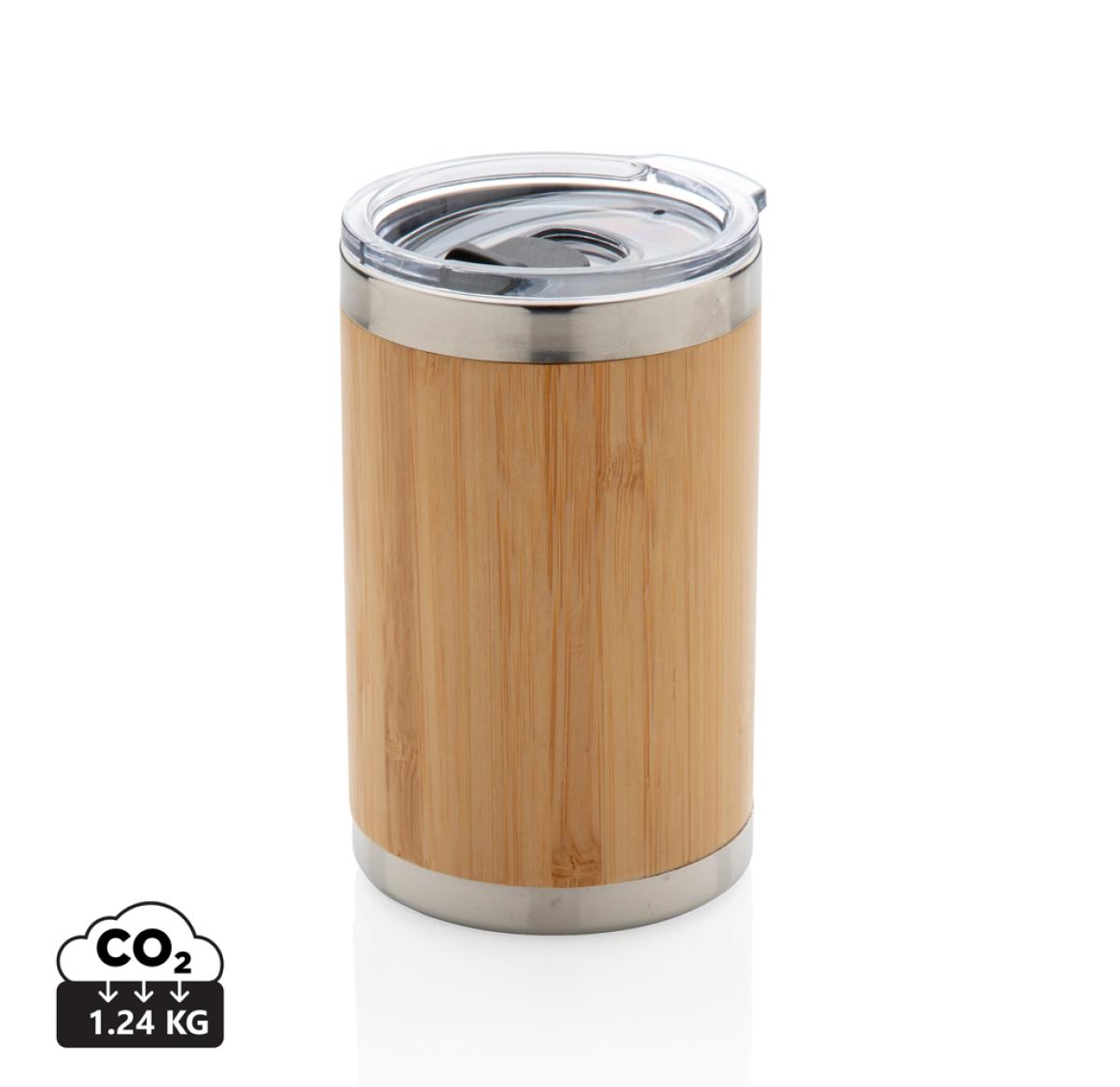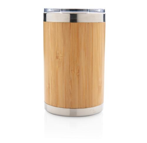 This unique bamboo coffee tumbler comes with 304 foodgrade and rustproof stainless steel interior walls and organic bamboo exterior. Perfect size to fit most coffee machines. Keep your drinks hot for up to 3h and cold for up to 6h. Content: 270 ml.