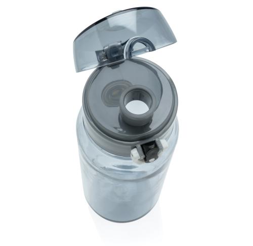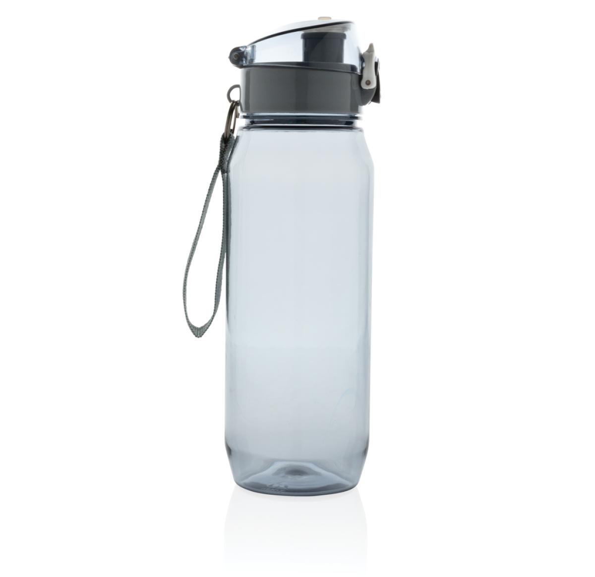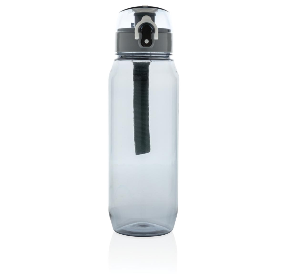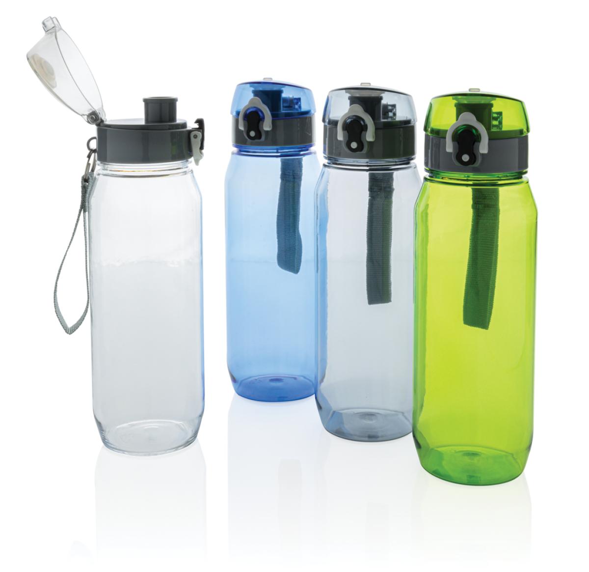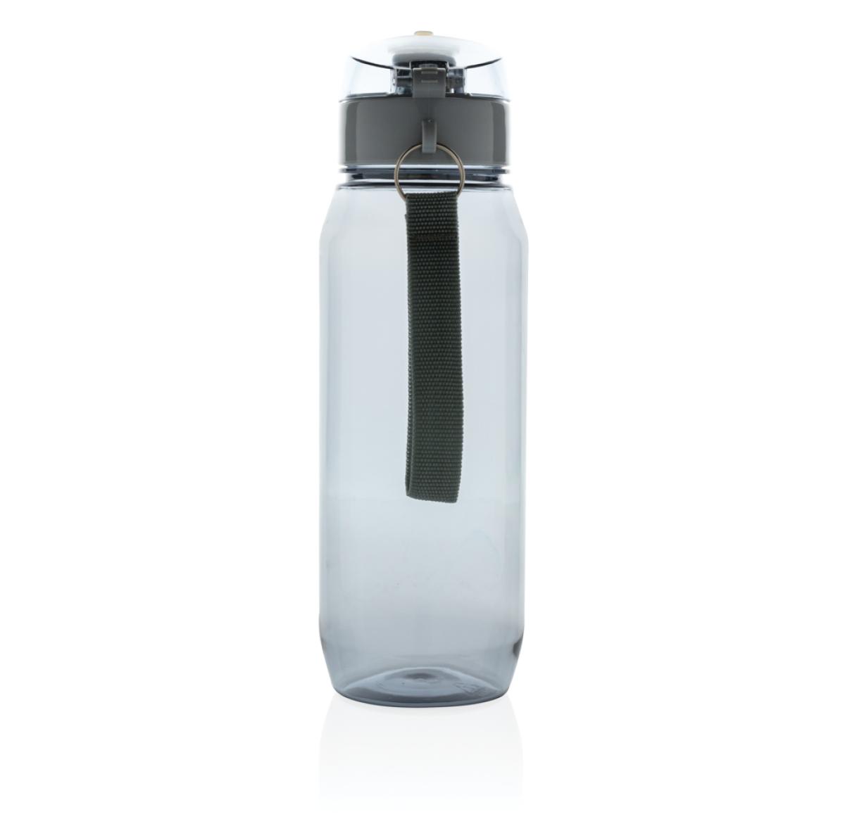 Leak proof tritan bottle with lockable cap and single hand 'press open' function. Including carrying strap. Odourless and 100% BPA-free. Content: 800ml.